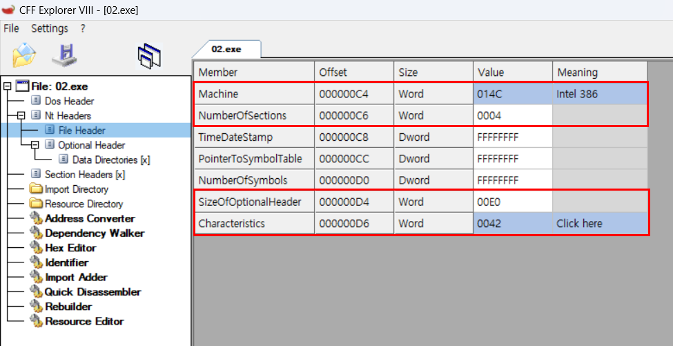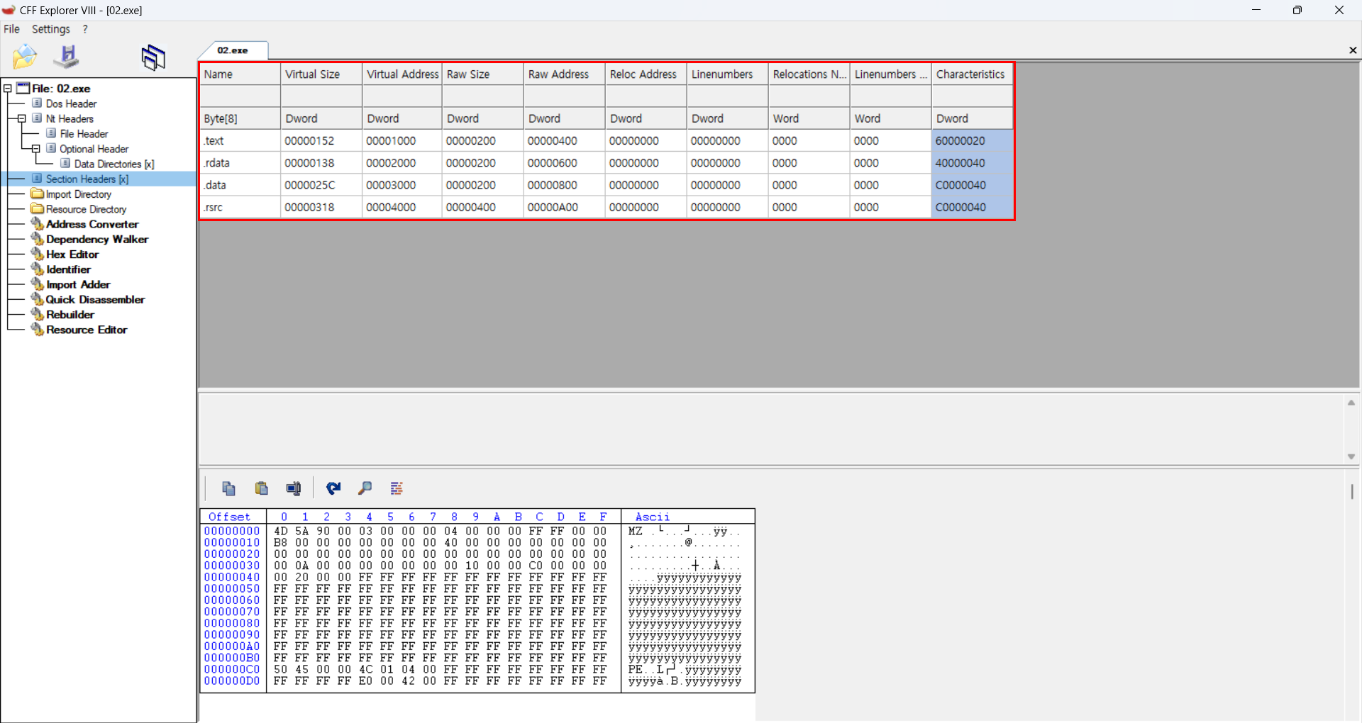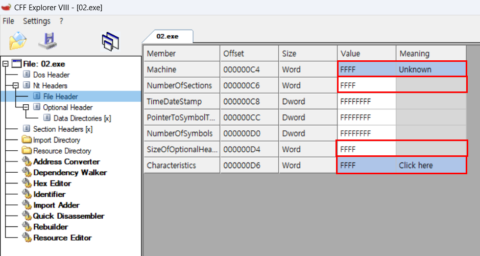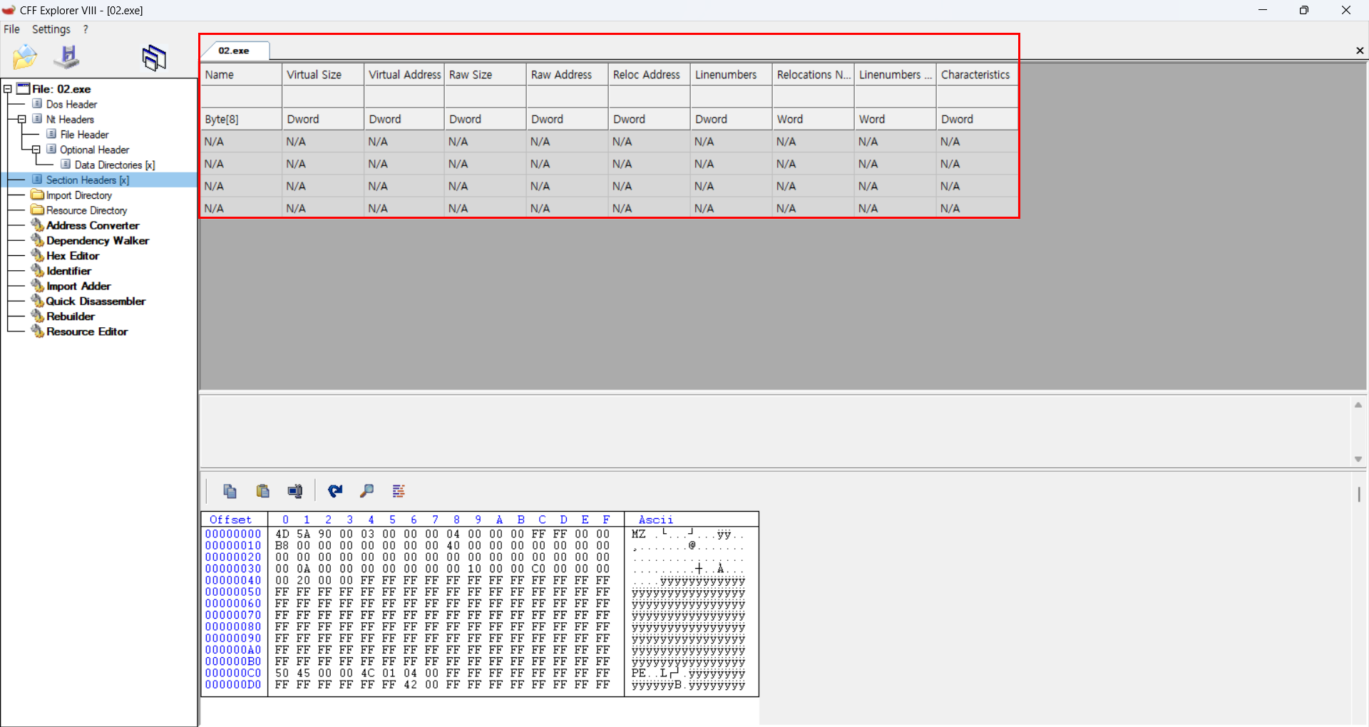 Section Header를 보면 값을 읽어오지 못한다는 것을 볼 수 있다. 그 이유는 SizeOptionalHeader 때문인데 값이 0xFFFF로 설정되어 있기 때문에 섹션을 읽지 못하는 것이다. Section Header는 SizeOptionalHeader의 오프셋으로 접근한다(File Header가 끄끝나는 지점 + SizeOptionalHeader). 따라서 값을 Optional Header의 크기만큼 설정해야 한다. (32bit의 경우 0xE0, 64bit의 경우 0xF0의 값을 가진다.)