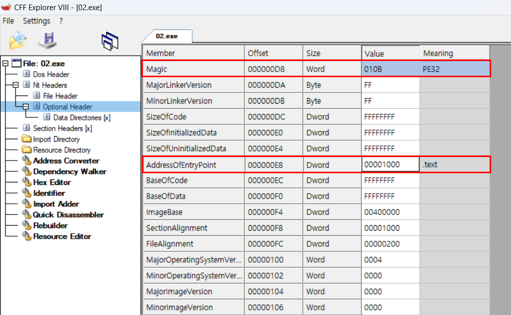 ImageBase 이후의 값은 제대로 잘 들어가 있는것으로 보였다. IAT도 확인해 본 결과 IDD, NAME 등 잘 나왔다. 이제 수정해야 할 값은 Magic과 AddressOfEntryPoint다. Magic은 32bit 실행파일인 것을 확인해 줬기 때문에 0x010B로 수정하면 된다. 문제는 AddressOfEntryPoint인데 .text의 RVA의 값이 EntryPoint를 보장하진 않는다. .text section의 RVA값을 넣고 EntryPoint가 아니면 디버거에서 OEP를 찾기로 했다. 따라서 AddressOfEntryPoint에는 일단 .text의 RVA값을 넣어줬다.