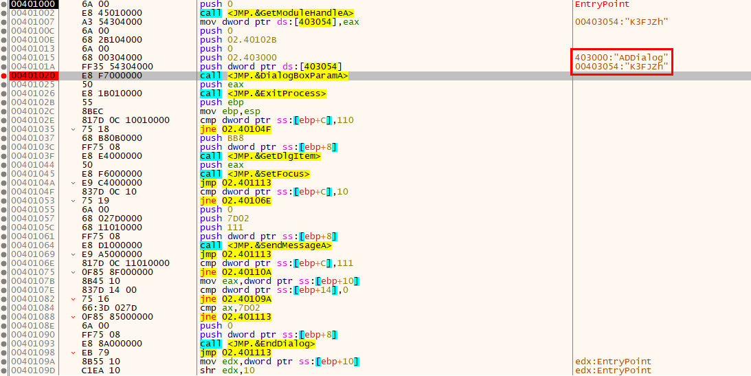 EntryPoint로 가면 GetmoduleHandleA 호출 후 mov해주는 코드가 있다.