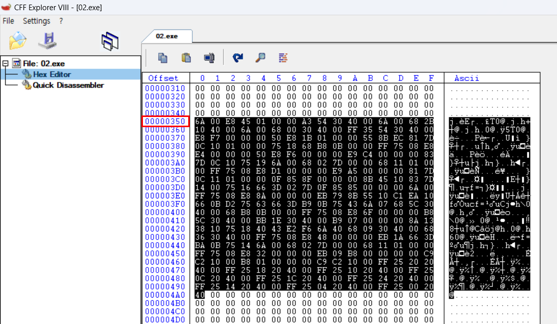 밑으로 내려서 .text section의 시작 주소를 확인해 보면 0x350이다. Raw Adress와 차이를 통해 얼만큼 삭제됐는지를 알아낼 수 있다. 원래 0x400위치에서 나타나야할 .text section이 0x350위치에서 나타났기 때문에 삭제된 데이터의 크기는 0xB0(176byte)이다.