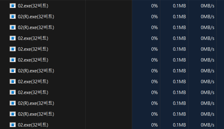 작업끝내기도 거부되는데 이 경우 CFF Explorer에서 02.exe를 열고 있기 때문에 종료가 안되고 해당 오류가 발생한다. 간단하게 CFF Explorer를 끄면 다시 정상적으로 동작한다.