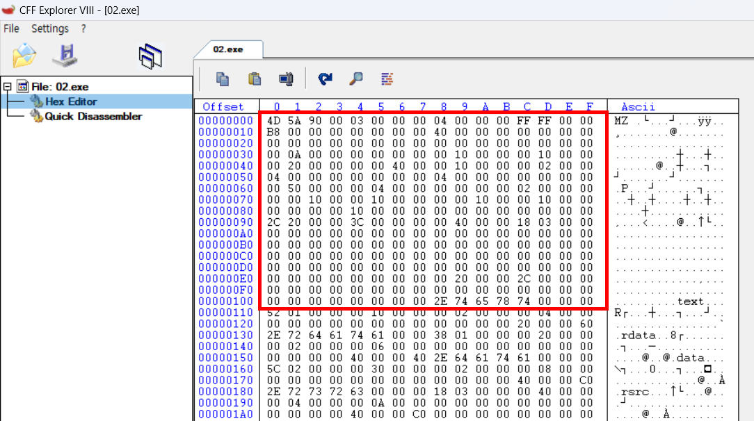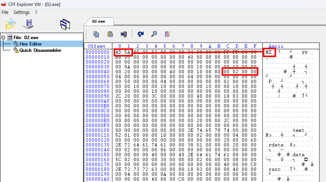 다시 처음으로 돌아와서 이제 삭제된 부분을 파악해 준다. 현재 파악할 수 있는것은 "MZ" 시그니처와 ".text"가 나타나는 섹션헤더 부분이다. 따라서 DOS Header ~ Section Header 사이에서 값들이 지워졌다는 것을 알 수있다.
