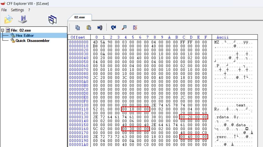 Section Header에서 각 섹션의 Virtual Address를 파악한다. 각각 .text(0x1000) .rdata(0x2000) .data(0x3000) .rsrc(0x4000)으로 나타난다. 값이 0x1000의 배수로 나타나는 점을 고려해 Optional Header의 Section Alignment의 값은 0x1000인 것을 파악할 수 있다. 실행파일의 경우 ImageBase값이 0x00400000으로 나타난다는 것을 활용해 Optional Header에서 남아 있는 값이 있는지와 값의 위치를 알아낼 수 있다. ImageBase(0x00400000)와 SectionAlignment(0x00001000) 값이 붙어 있기 때문에 0x00004000 00100000의 값이 존재하는지 확인하면 된다(리틀엔디언).