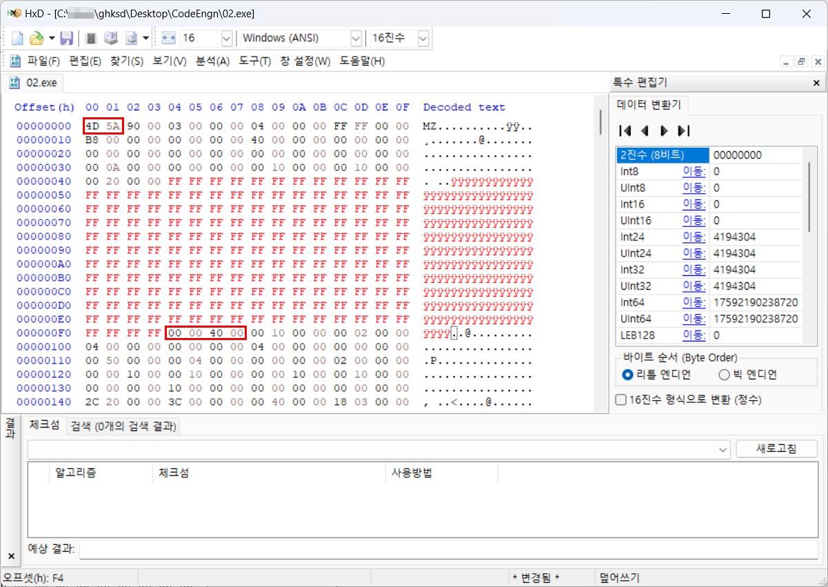 SizeOptionalHeader의 값을 0xE0으로 수정했을 때 Section Header의 값이 제대로 들어왔다. 따라서 해당 파일은 32bit 실행파일 인 것을 알 수 있다.