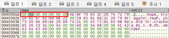 비교하는 값을 확인해 보면 전부 0x00이다. 입력한 문자열과 0x00을 비교하는 반복문이다(총 7번). 따라서 입력이 없을 때 MessageBoxA가 출력된다. 만약 입력값이 있으면 분기 하여 MessageBoxA를 호출하지 않고 다음 동작을 수행한다. 결과적으로 입력값이 있을 때는 아무런 동작을 하지 않는다.