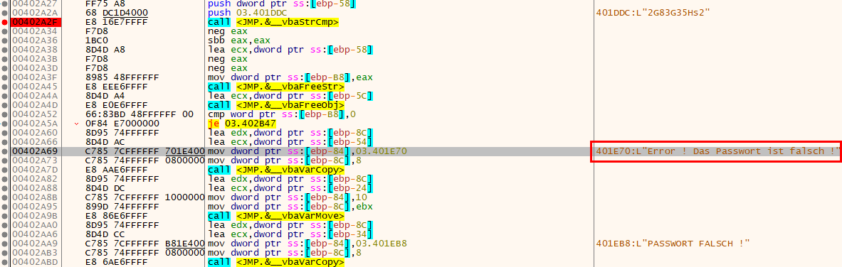 메시지를 출력하는 부분이다. 조금 위의 코드를 살펴보면 vbaStrCmp 함수를 볼 수 있다.