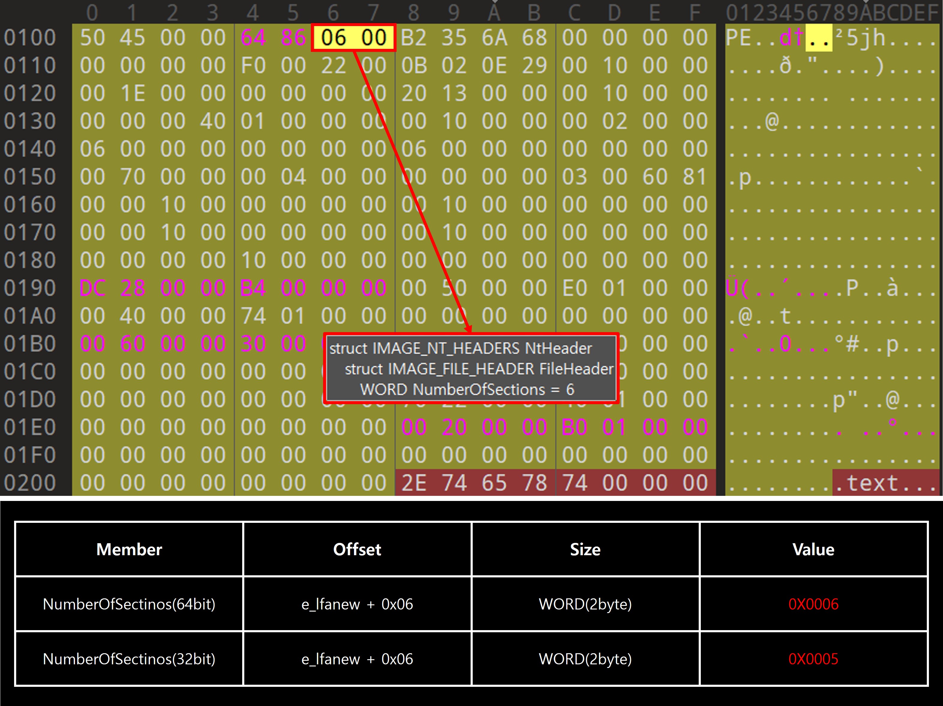 | NumberOfSections | WORD | 2 | 섹션 수입니다. 이는 머리글 바로 뒤에 오는 섹션 테이블의 크기를 나타냅니다. Windows 로더는 섹션 수를 96으로 제한합니다. |