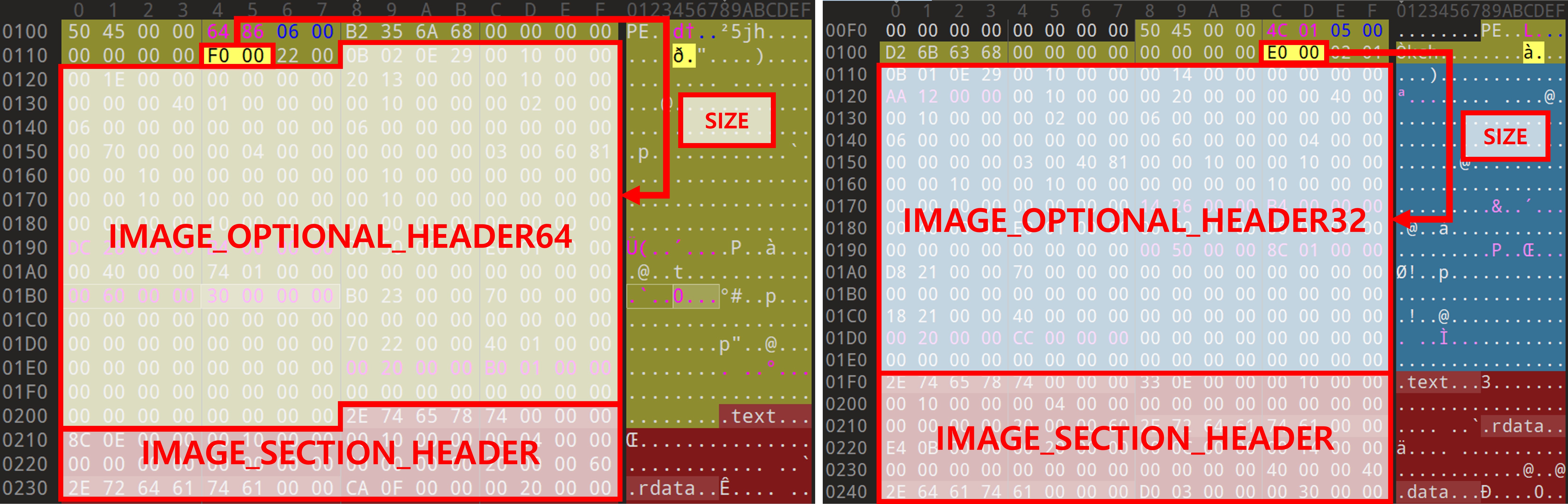 SizeOfOptionalHeader 멤버는 32비트에서 0x00E0 64비트에서 0x00F0으로 설정되어있다. 이러한 값의 차이는 구조체 내 필드 구성 및 자료형 크기 차이로 인한 결과이며 32비트와 64비트 플랫폼 간 IMAGE_OPTIONAL_HEADER 구조의 차이를 보여준다.