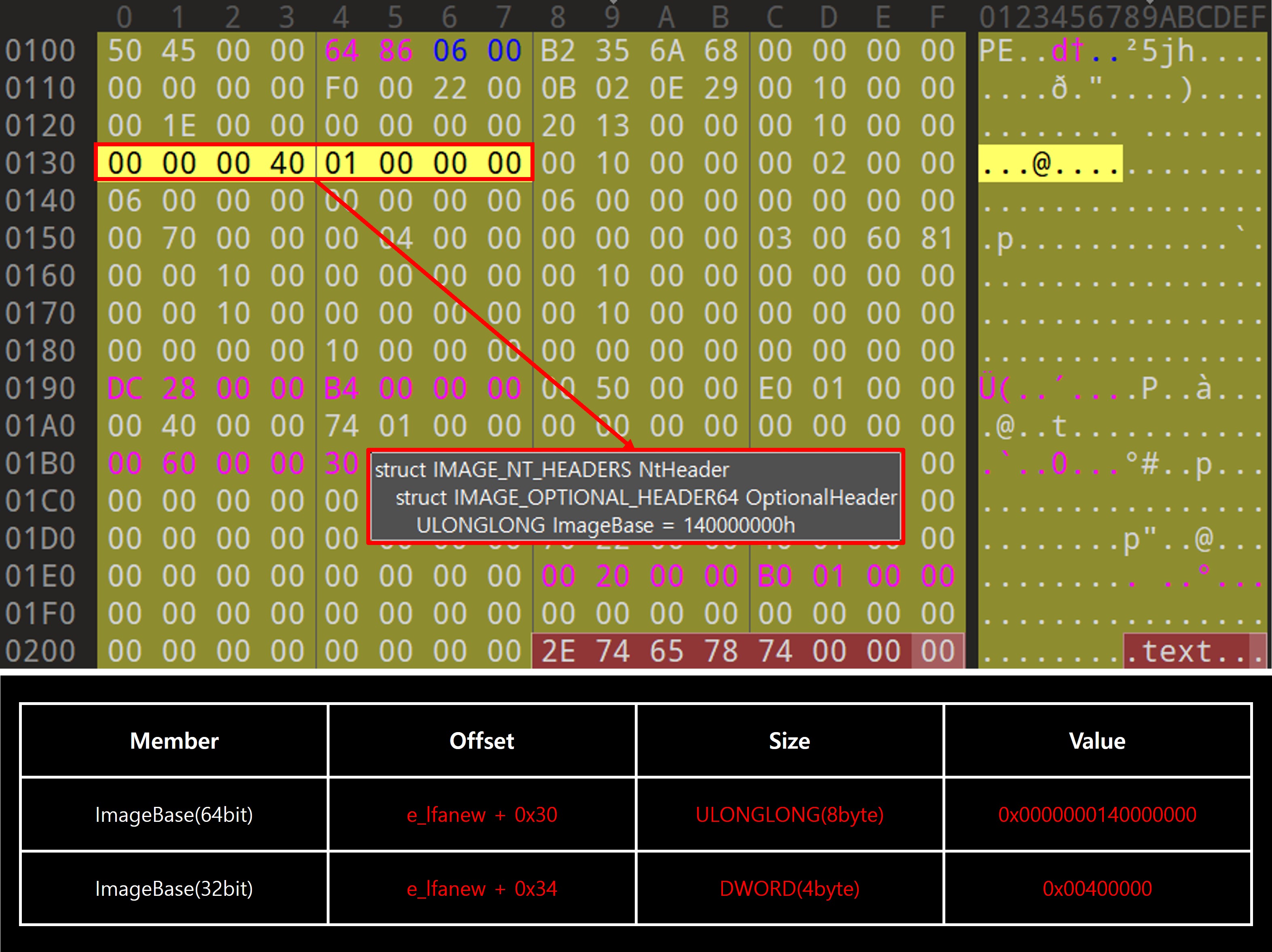 ImageBase 멤버는 PE 파일이 메모리에 로드될 때 기준이 되는 가상 주소를 나타내는 필드다. 32비트에서는 DWORD(4byte)로 정의되며 주소 지정 범위가 제한된다. 반면 64비트에서는 ULONGLONG(8byte)으로 확장되며 이는 64비트 아키텍처에서 제공하는 더 넓은 가상 주소 공간을 활용하기 위함이다. 이러한 자료형의 차이는 단순한 크기 확장이 아니라 플랫폼마다 가상 메모리를 다루는 방식과 요구사항이 전혀 다르다는 점에서 기인한 것으로 32비트와 64비트 실행 환경에 따라 구조체 내 멤버의 크기가 달라질 수 있음을 보여준다.