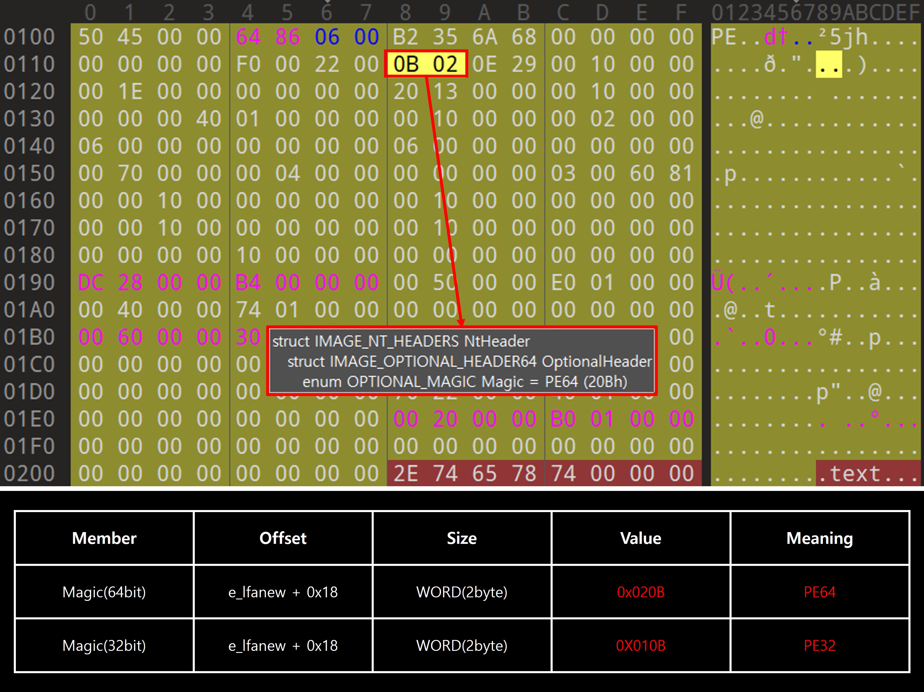 Magic 멤버는 해당 PE 파일이 32비트용인지 64비트용인지를 구분하는 식별자다. 32비트에서는 0x010B(PE)가 사용되고 64비트에서는 0x020B(PE+)가 사용된다. 이 값은 구조체 해석 방식에 직접적인 영향을 주며 윈도우로더는 이 값을 기반으로 이후의 Optional Header를 IMAGE_OPTIONAL_HEADER32로 파싱할지 IMAGE_OPTIONAL_HEADER64로 파싱할지를 결정한다. Magic 필드의 차이는 단순한 구분이 아니라 전체 PE 구조의 해석 방향을 바꾸는 역할을 하므로 플랫폼에 따라 명확히 구분되어야 하며 그 존재 자체가 구조 설계 차이의 핵심을 보여준다.