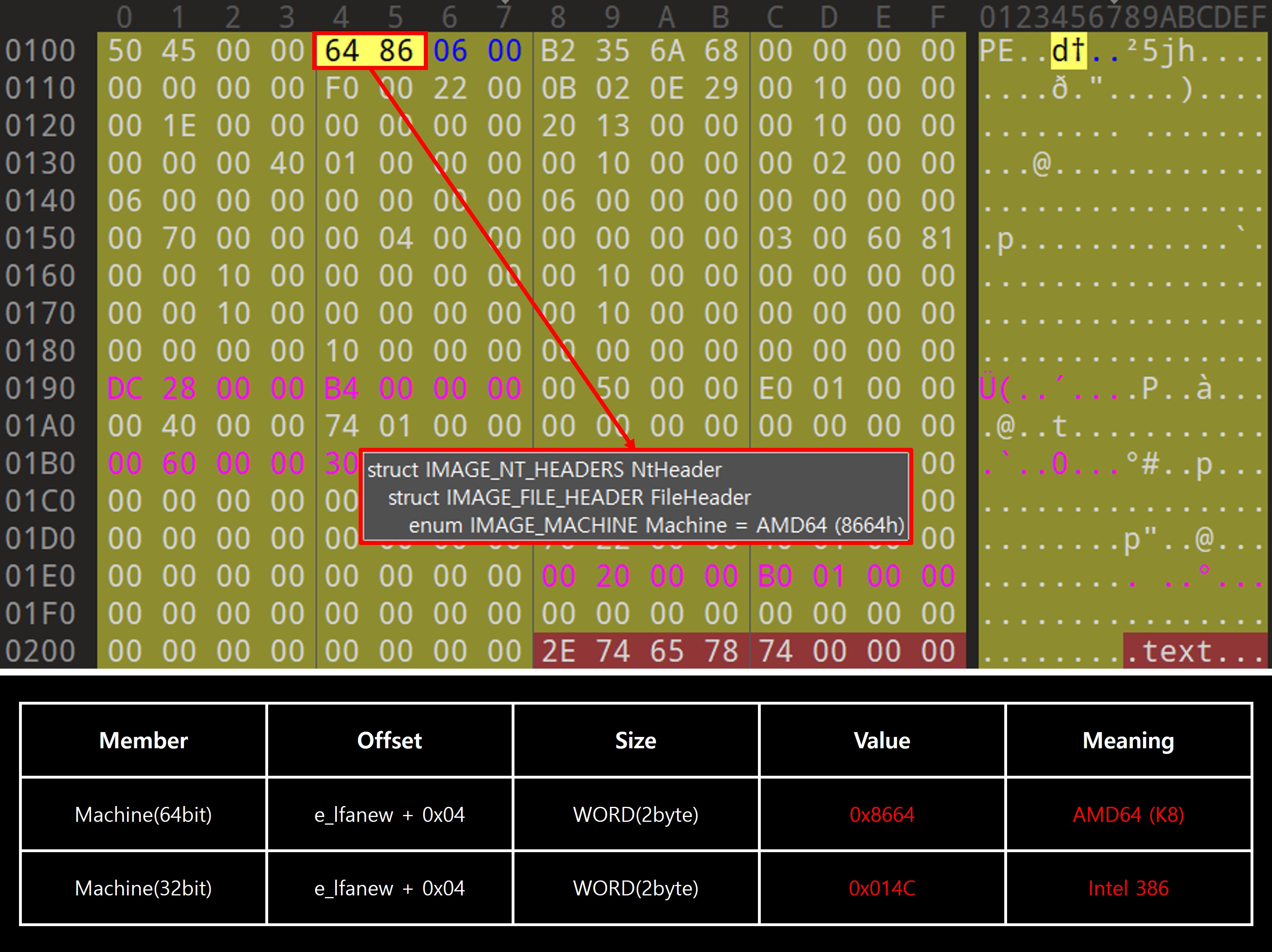 Machine 멤버는 실행 파일이 어떤 아키텍처에서 실행될 것인지를 나타내는 필드다. 이 필드는 대상 CPU 아키텍처에 따라 고유한 값을 갖도록 정의되어 있으며 32비트와 64비트 플랫폼 간의 구조 차이를 직접적으로 반영한다. 32비트에서는 0x014C(IMAGE_FILE_MACHINE_I386)가 사용되며 이는 Intel x86 아키텍처를 의미한다. 반면 64비트에서는 0x8664(IMAGE_FILE_MACHINE_AMD64)가 지정되어 x64 아키텍처에서 실행됨을 명시한다. 이 차이는 전혀 다른 명령어 집합 구조(Instruction Set Architecture, ISA)를 대상으로 하기 때문에 발생하며 윈도우로더는 이 값을 통해 해당 실행 파일을 현재 시스템에서 실행할 수 있는지 판단한다. 따라서 Machine 필드는 32비트와 64비트 PE 파일 간의 가장 근본적인 구조 차이를 드러내는 멤버로 간주할 수 있다.