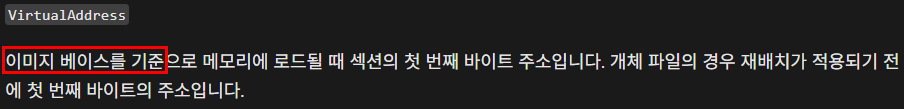RVA는 PE 파일 실행 시 메모리 상에서의 상대적 위치이며 그 기준점이 ImageBase이기 때문에 위 관계식이 성립한다. 여기서 VA는 프로세스 내부 기준 절대 주소다. IMAGE_SECTION_HEADER의 VirtualAddress(RVA)를 의미하지 않는다.