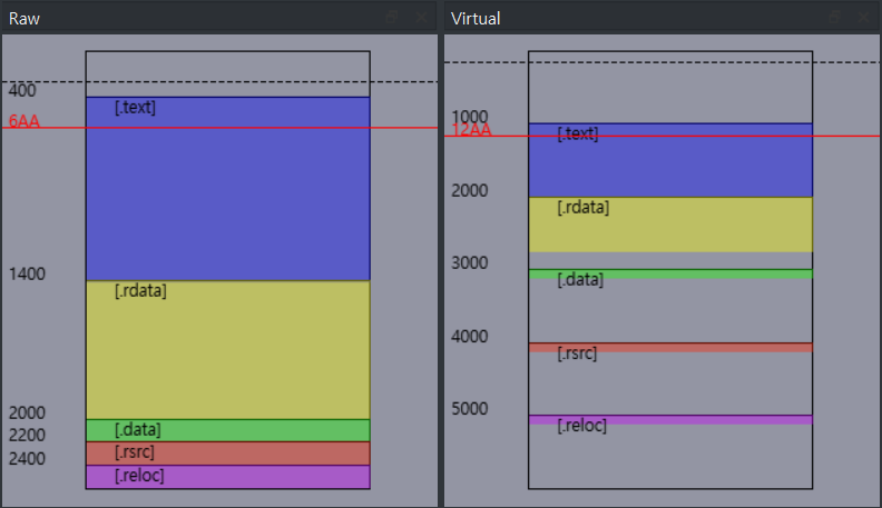 RAW는 PE 파일에서 데이터가 디스크에 저장된 실제 물리적 위치인 파일 내부의 오프셋(offset)을 의미한다. 이는 파일이 메모리에 로드되기 전 디스크 상에서 코드나 데이터가 존재하는 위치를 바이트 단위로 나타낸 것이다. RAW에서 오프셋의 기준은 항상 파일의 시작이다.