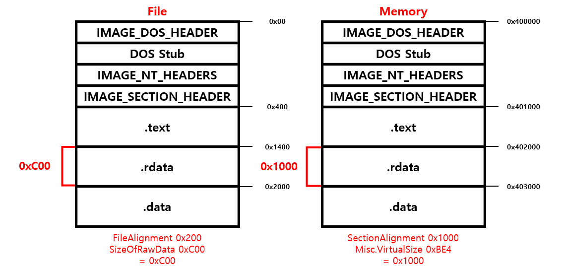이와 같은 오류가 발생하는 이유는 .rdata 섹션의 파일 상 크기와 메모리 상 크기가 다르기 때문이다. PE 파일은 디스크에서는 FileAlignment 단위로 정렬되고 메모리에서는 SectionAlignment 단위로 정렬된다. 따라서 File에서 .rdata 섹션의 크기는 SizeOfRawData인 0xC00이고, 메모리에서 .rdata 섹션의 크기는 Misc.VirtualSize를 SectionAlignment로 라운드 업 한 크기인 0x1000이다. (SizeOfRawData의 경우 FileAlignment로 라운드 업 되어 있으며 Misc.VirtualSize는 그렇지 않다.)