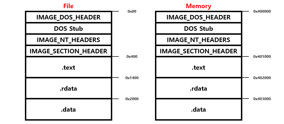 RVA to RAW 비례식이 성립하는 이유는 PE 파일의 각 섹션이 디스크와 메모리에서 동일한 순서와 구조로 배치되기 때문이다. 이를 확인하기 위해 파일 상의 섹션과 메모리에 로드된 섹션을 비교하여 그 일치 여부를 분석한다.