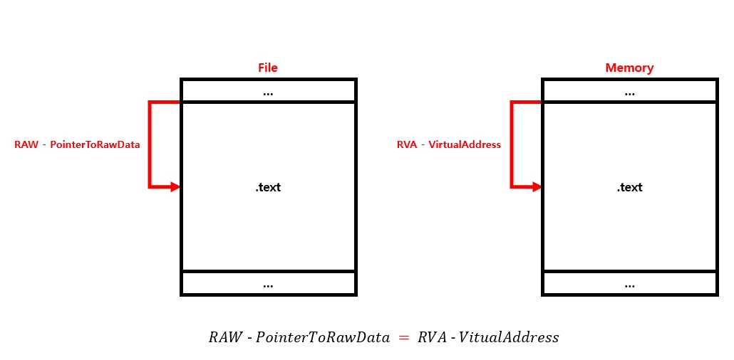 이 두 값이 같다는 의미는 처음 주어진 RVA 값을 기준으로, 메모리 상에서 .text 섹션 내부에서의 위치와 디스크 상에서 .text 섹션 내부에서의 위치가 동일한 간격을 가지고 있다는 뜻이다. 해당 데이터는 메모리에 로드되었을 때나 디스크 상에 존재할 때나 모두 .text 섹션의 시작 지점을 기준으로 같은 거리만큼 떨어져 있다는 것이다. 따라서 비례식을 쉽게 풀어보면 "RVA가 섹션의 시작 위치로부터 메모리에서 이 정도 떨어져 있으니 파일에서도 섹션 시작 지점으로부터 이만큼 떨어져 있겠지" 라는 의미가 된다.