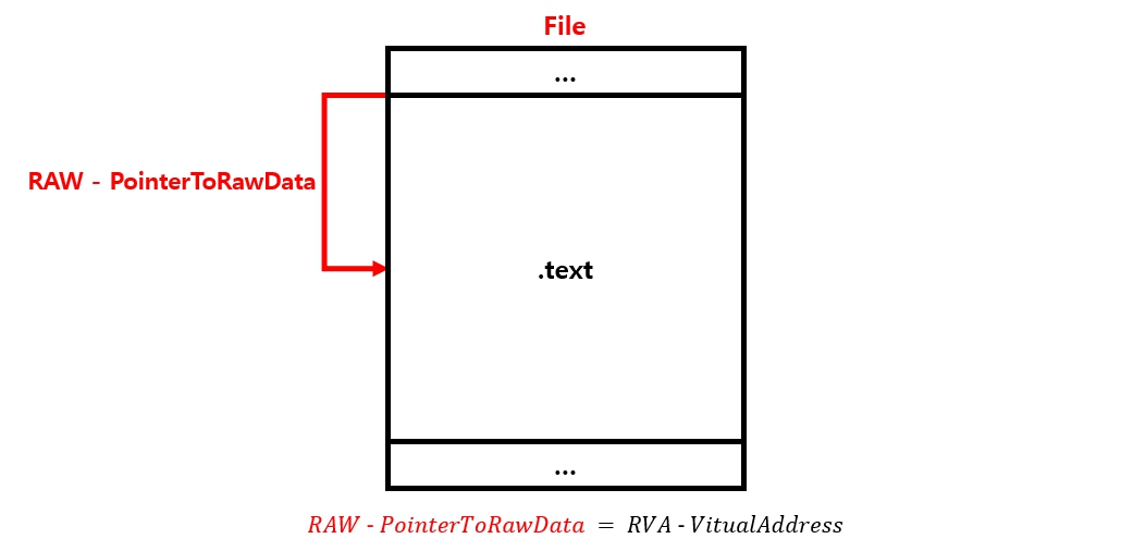 특정 RVA값을 알고 있다고 가정한다. 이 값을 앞서 설명한 비례식에 대입해 RAW 오프셋을 구하려는 상황이다. 해당 RVA는 .text 섹션에 속해 있으므로 비례식에 사용되는 PointerToRawData와 VirtualAddress는 IMAGE_SECTION_HEADER 구조체 중 .text 섹션의 멤버 값을 사용해야 한다.