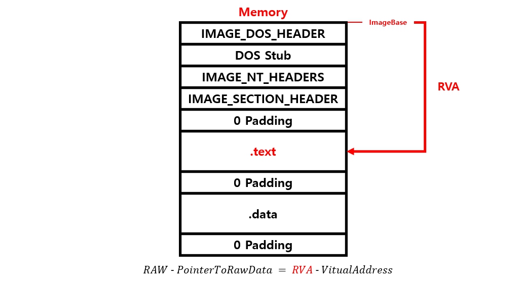 IMAGE_SECTION_HEADER.VirtualAddress는 PE 파일 실행 시 .text 섹션이 메모리에 적재될 때의 RVA를 의미한다. 즉, ImageBase를 기준으로 .text 섹션이 어느 위치에서 부터 메모리에 배치될지를 나타낸다.