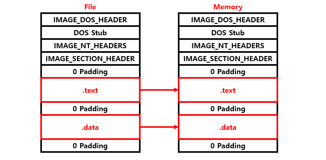 일부 값이 달라진 빨간색 영역은 실행 시 IAT(Import Address Table)에 의해 실제 함수 주소로 덮어써진 부분이다. 이처럼 데이터 값에는 차이가 있을 수 있지만 섹션의 구성과 배치 구조가 그대로 유지된다는 점이 중요하다.