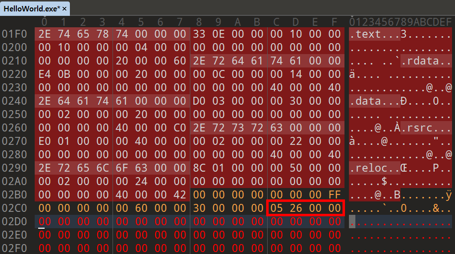 PointerToRawData를 0x2605로 설정해도 0x2600부터 값을 읽어온다는 것을 알 수 있다. 오프셋이 0x2000인 이유는 권한이 같아서 .rsrc에 병합되었기 때문이다.