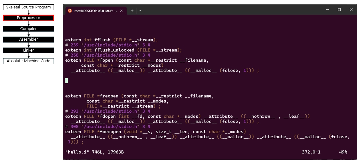 hello.c에는 전처리 지시문, 함수 정의, 주석 등이 그대로 들어 있다. 프로그램의 논리와 의도를 사람이 이해할 수 있는 형태로 담아 전처리기로 넘기는 출발점이 된다.