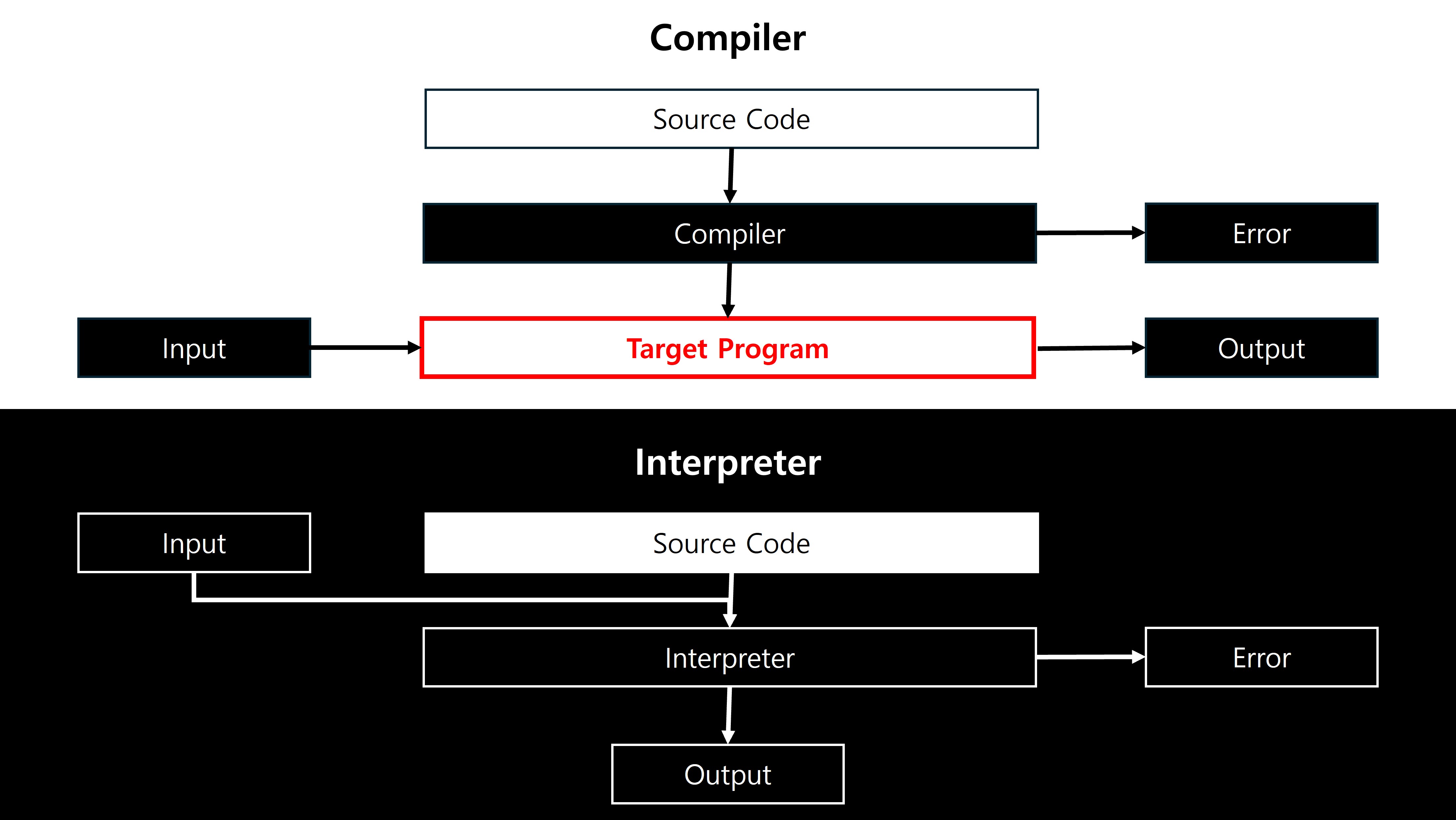 일반적으로 C, C++은 소스 코드를 기계어로 변환해 목적 프로그램 또는 실행파일(exe)을 만들고, Python은 실행 시점에 소스를 바이트코드로 변환해 인터프리터(VM)가 즉시 실행하는 인터프리트 방식을 택한다. Java는 두 방식의 중간쯤에 위치해 소스를 먼저 바이트코드(.class)로 컴파일한 뒤 JVM이 그 바이트코드를 실행한다. 컴파일 방식은 한 번 빌드해 목적 프로그램을 만들어 두면 소스 없이도 반복 실행할 수 있는 반면, 인터프리트 방식은 매 실행마다 소스와 해당 인터프리터 환경이 함께 있어야 한다는 점이 가장 큰 차이다.