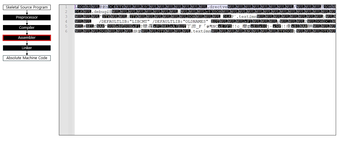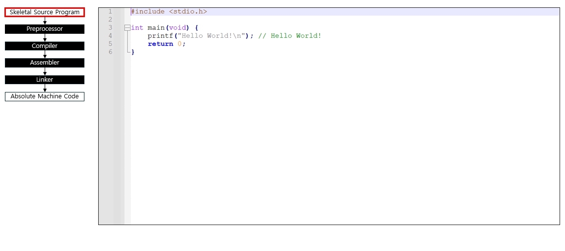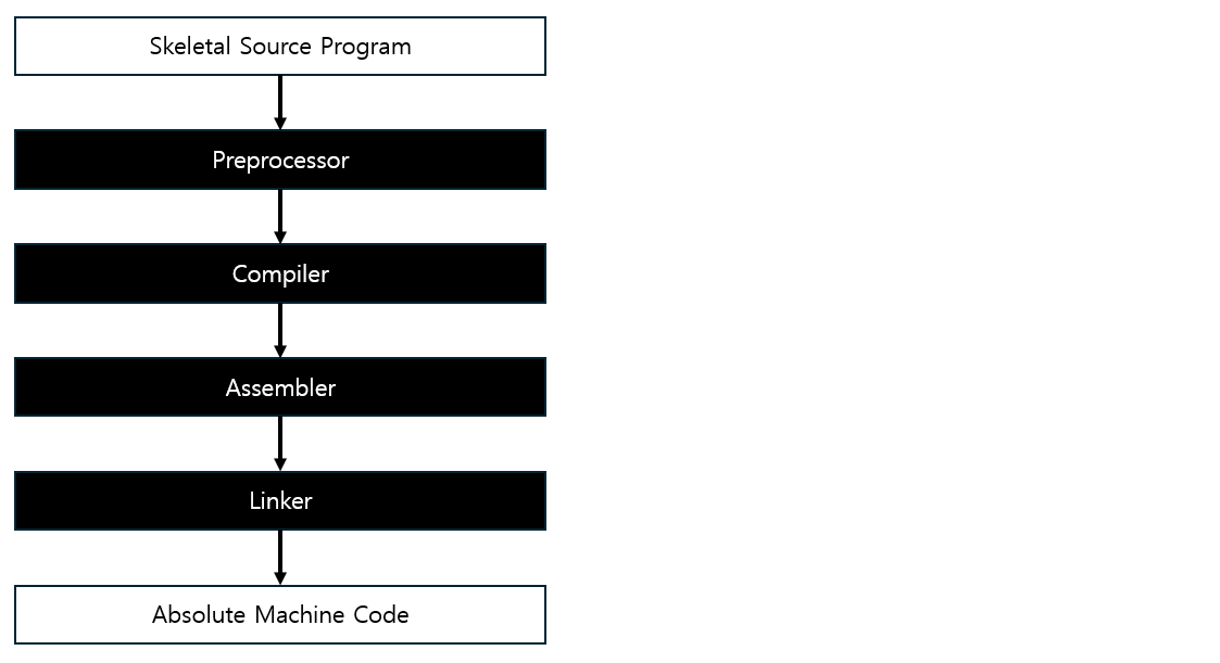 (1) (소스) Skeleton Source → (2) 전처리기(Preprocessor) → (3) 컴파일러(Front-Back-End) → (4) 어셈블러 → (5) 링커 → (6) 완전한 실행 파일(Absolute Machine Code)