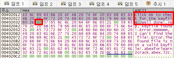 표시할 메시지의 텍스트 데이터는 0x402012에 있다. 해당 위치로 가보면 메시지 창의 메시지를 알 수 있다.