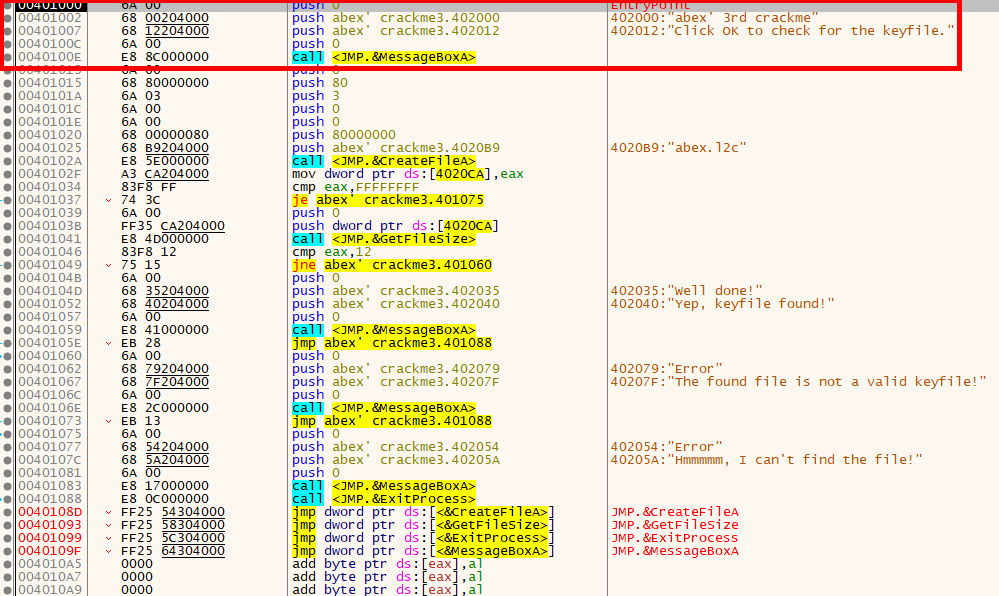 x32dbg에서 실행한 뒤 EntryPoint는 위와 같다. abex' crackme 1과 비슷하게 코드의 길이가 매우 짧다는 것을 알 수 있다.