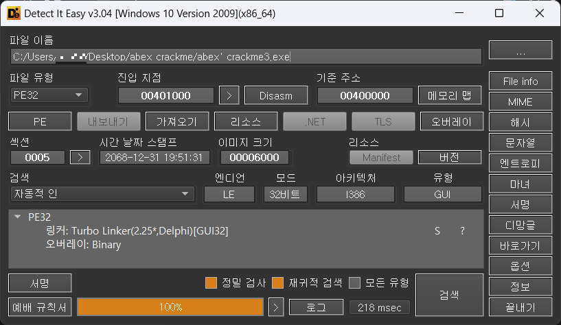 32비트 실행파일, 델파이로 작성된 프로그램인 것을 알 수 있다.