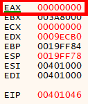 CreateFileA의 값을 0x4020CA에 mov하는 과정에서 EAX의 값을 보면 INVALID_HANDLE_VALUE인 것을 알 수있다. 해당 값을 INVALID_HANDLE_VALUE 아닌 값으로 수정한다(에러 처리 분기가 발생하지 않음).