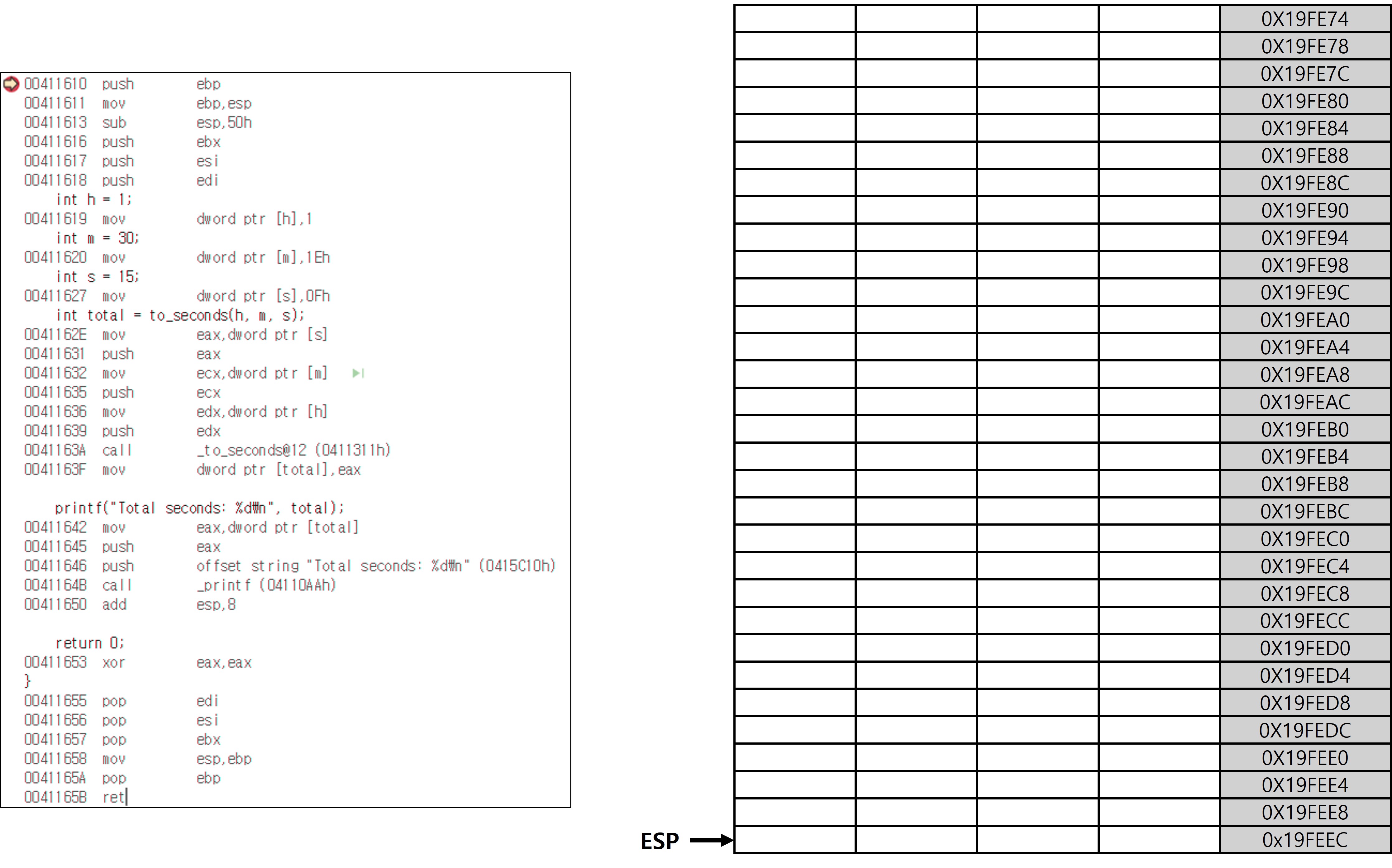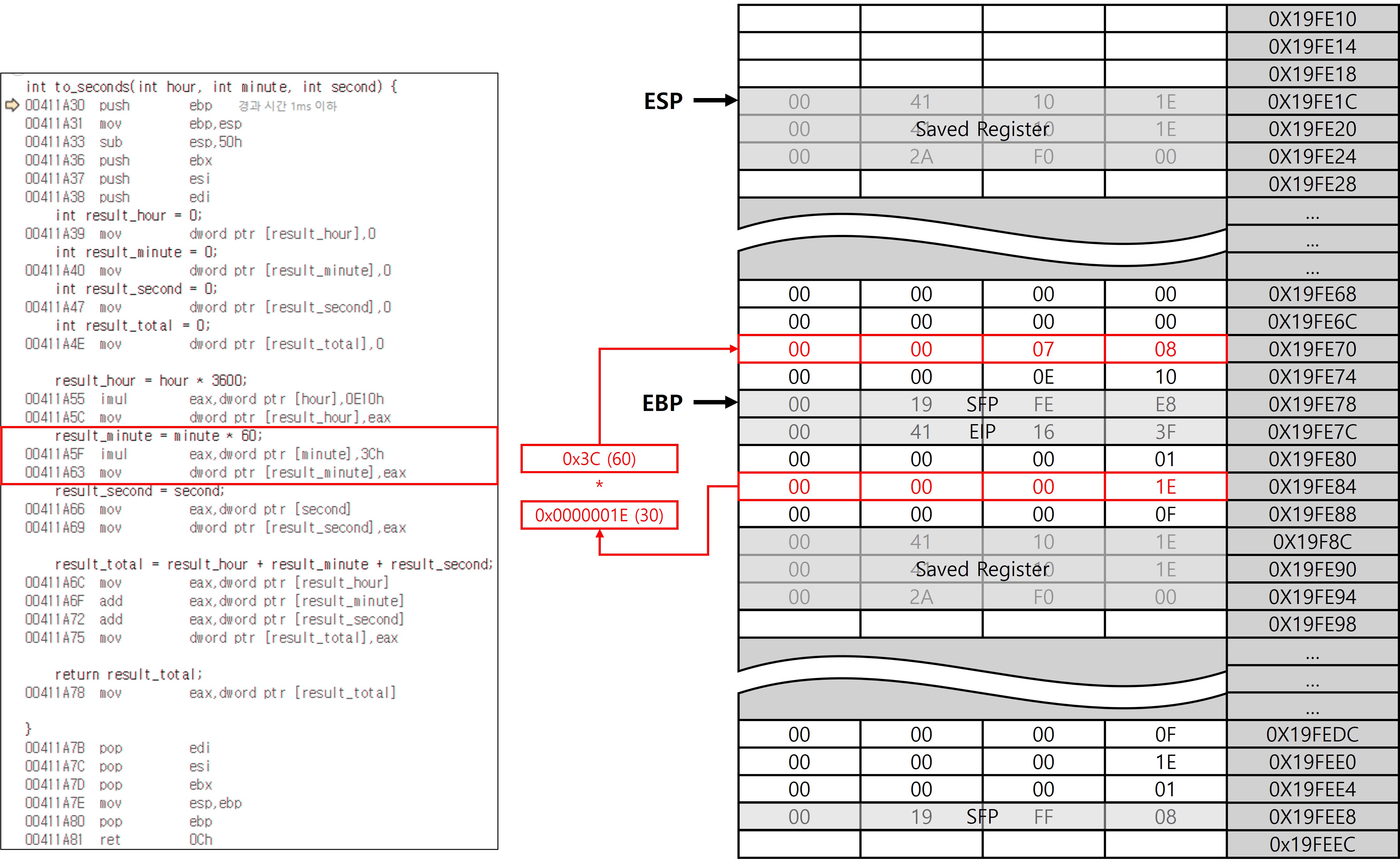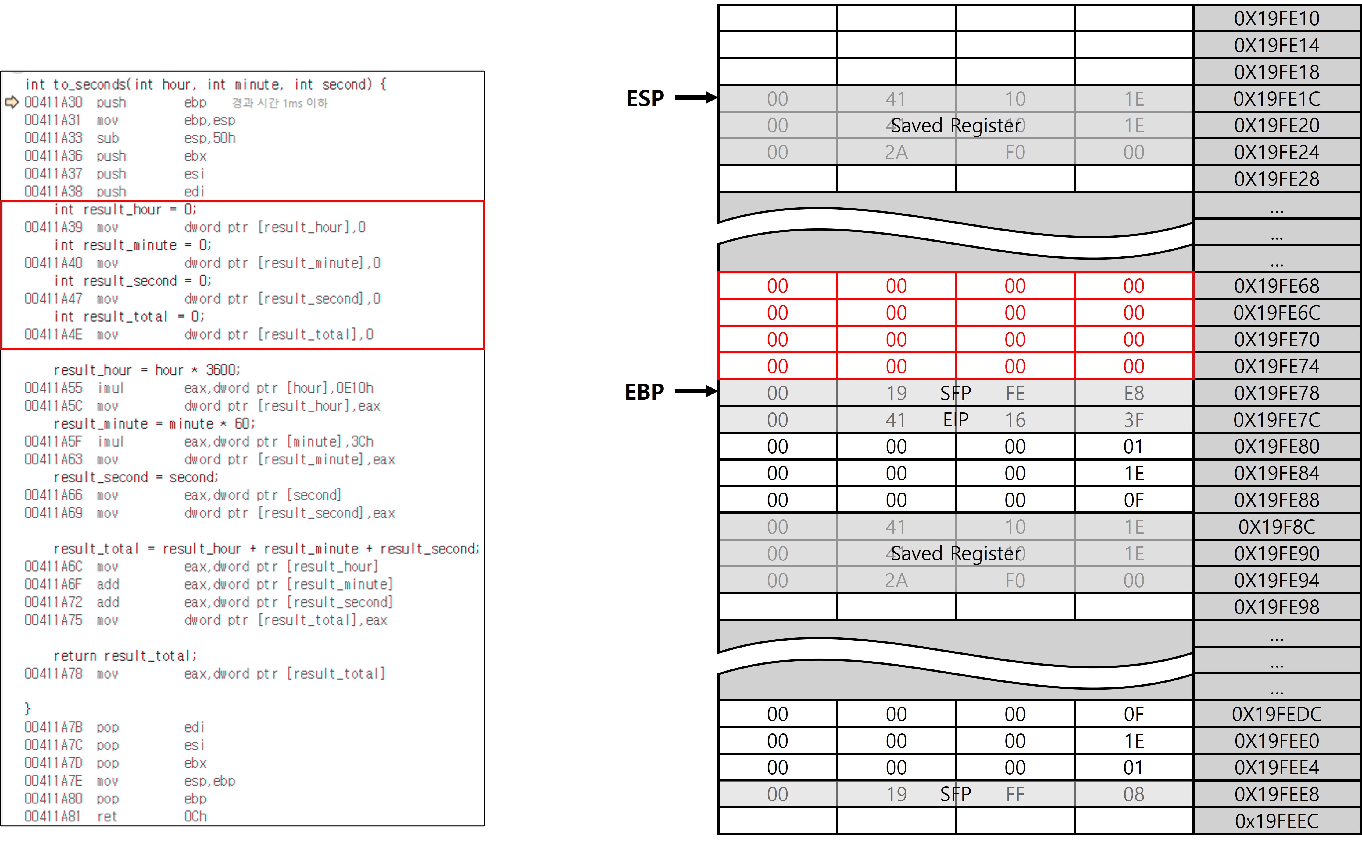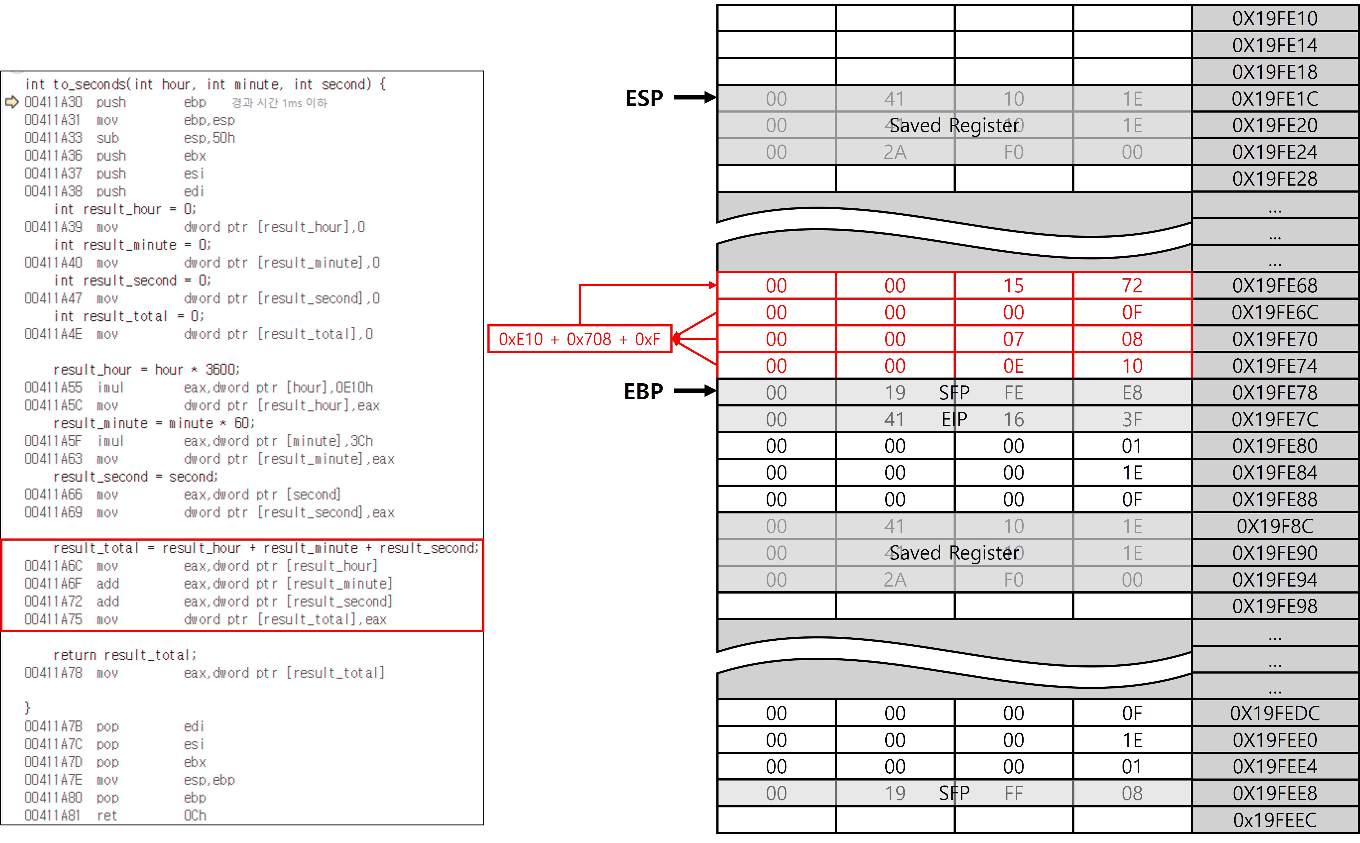 위의 코드는 시, 분, 초를 각각 초 단위로 환산한 뒤 합산하는 단순한 흐름으로 되어 있다. 해당 코드를 토대로 스택 프레임이 어떻게 생성되고 소멸하는지를 단계별로 살펴본다.