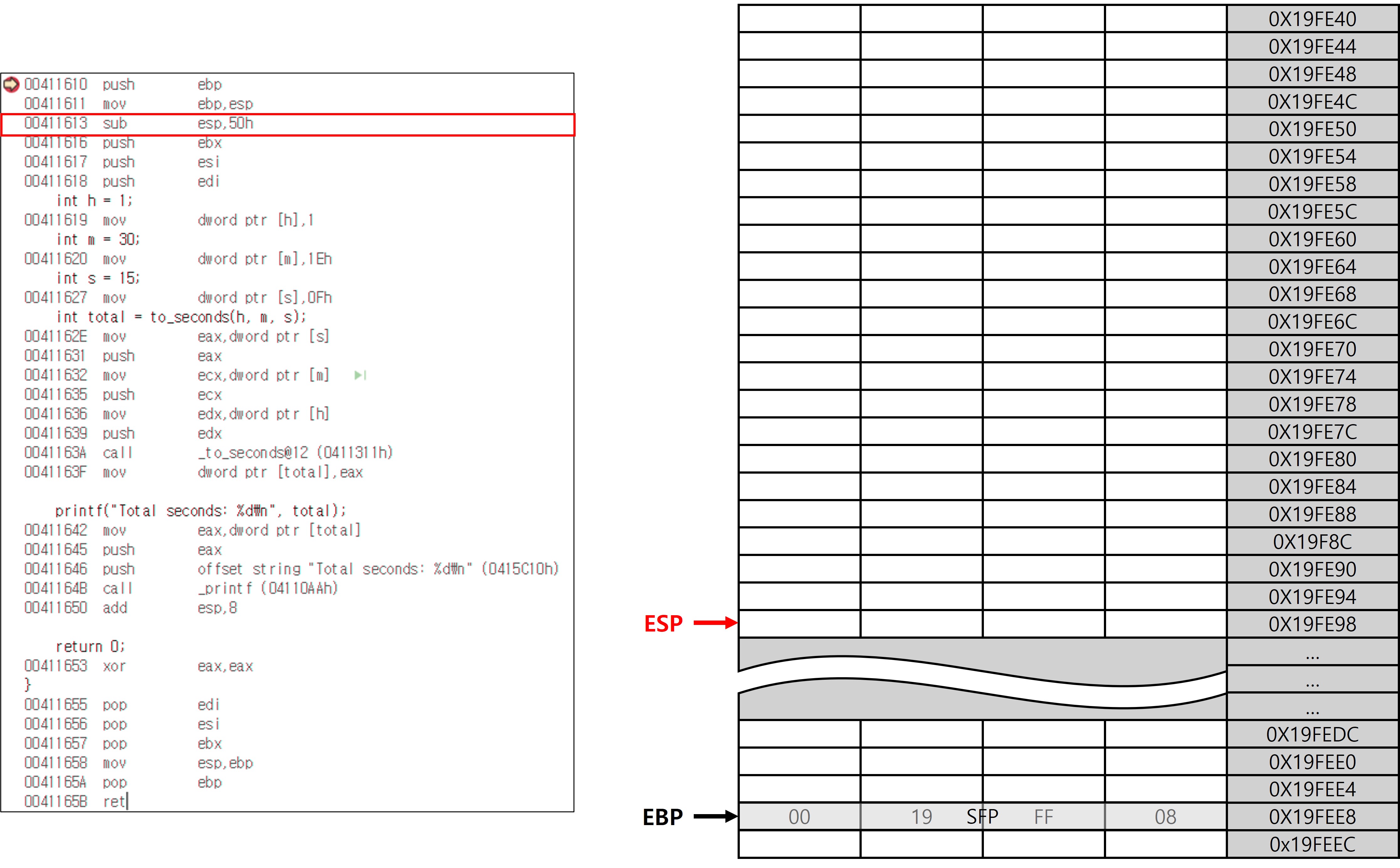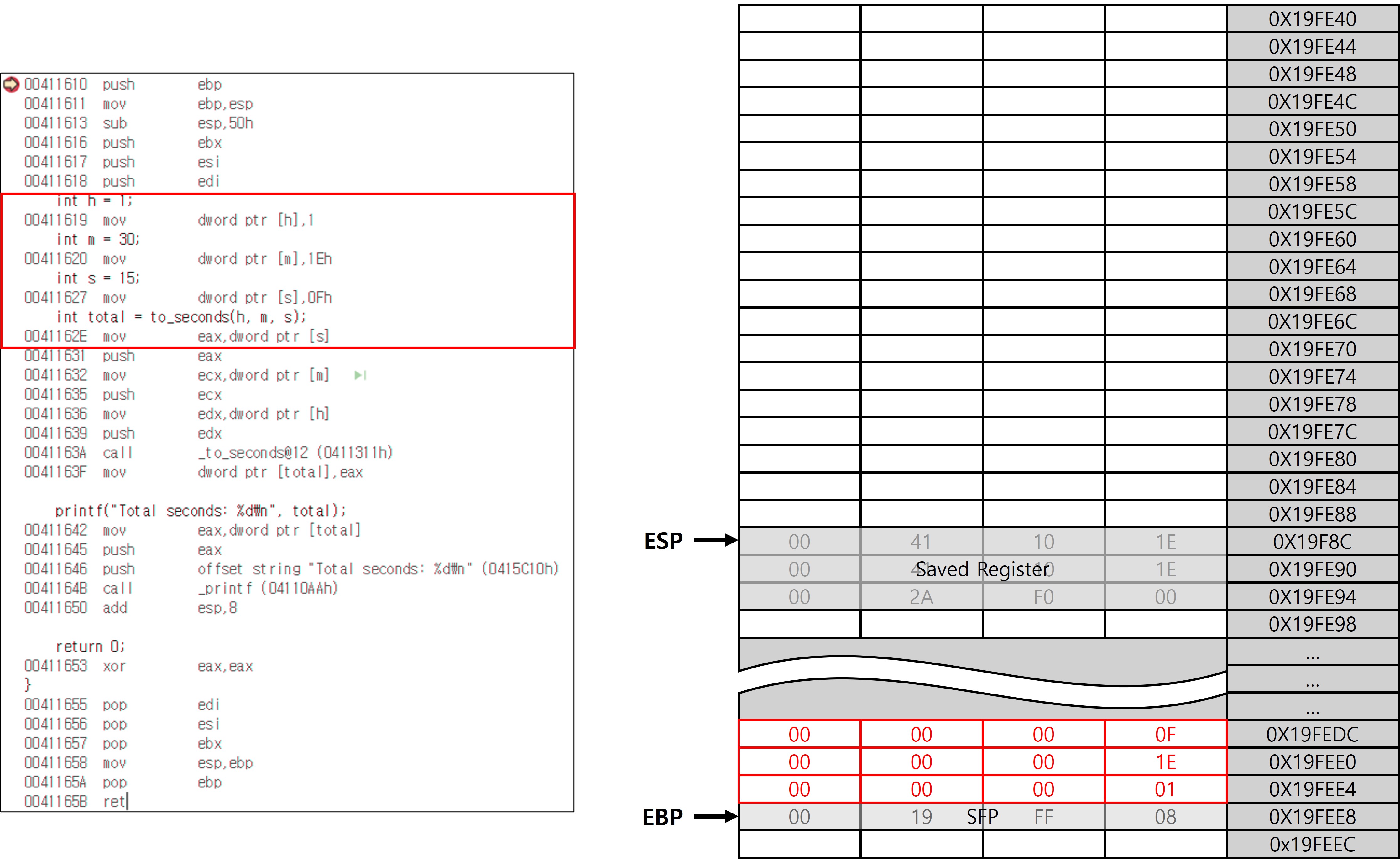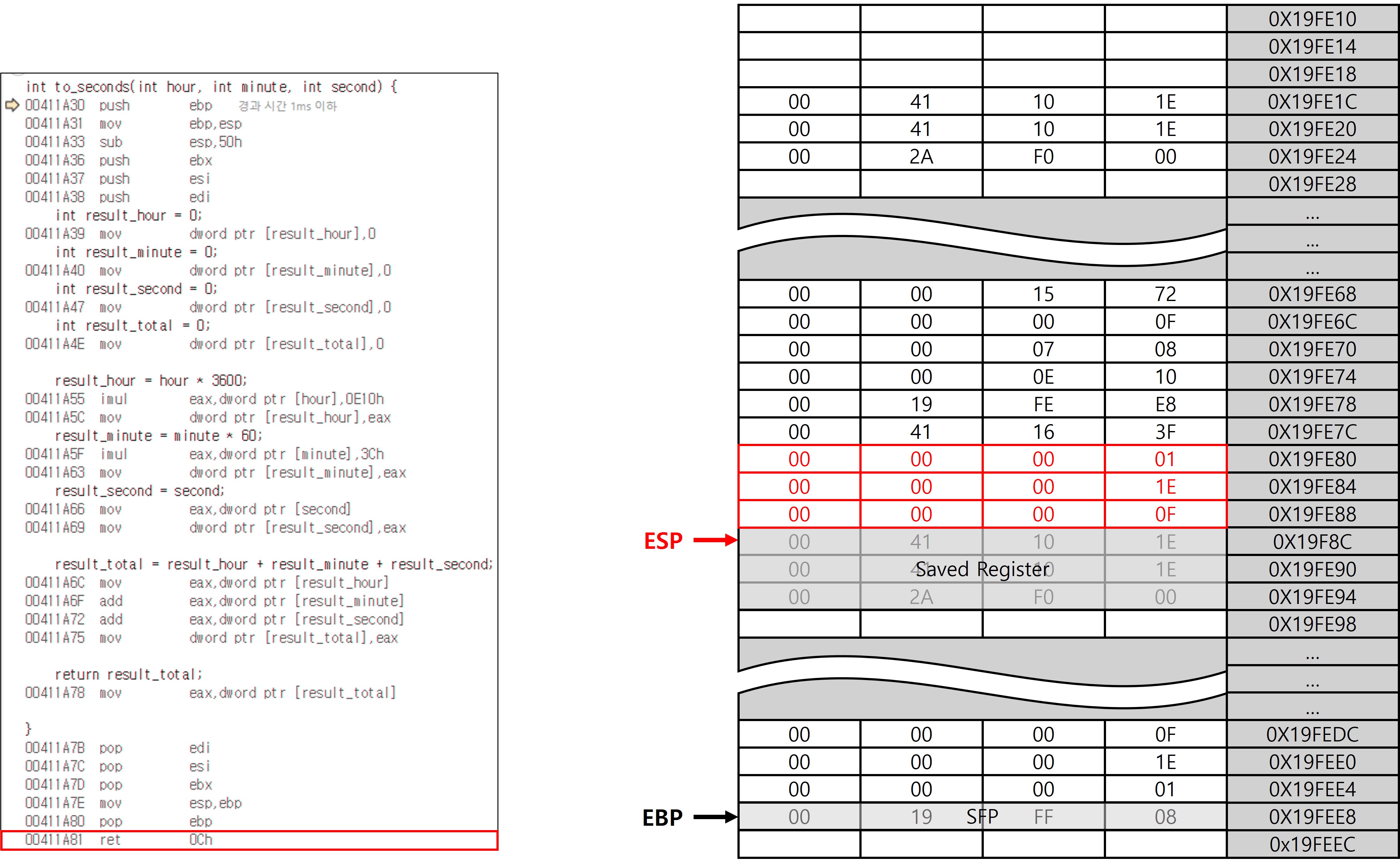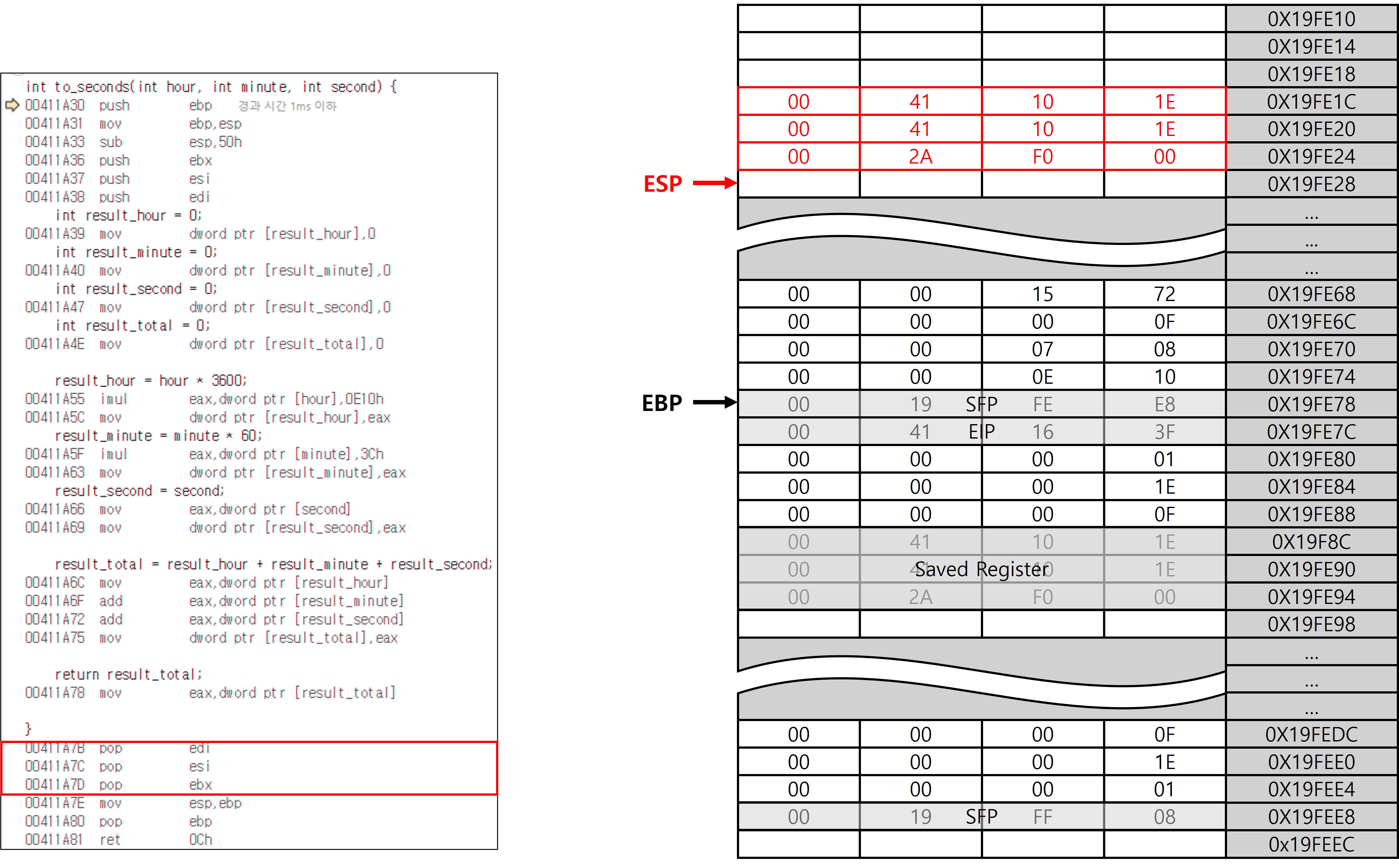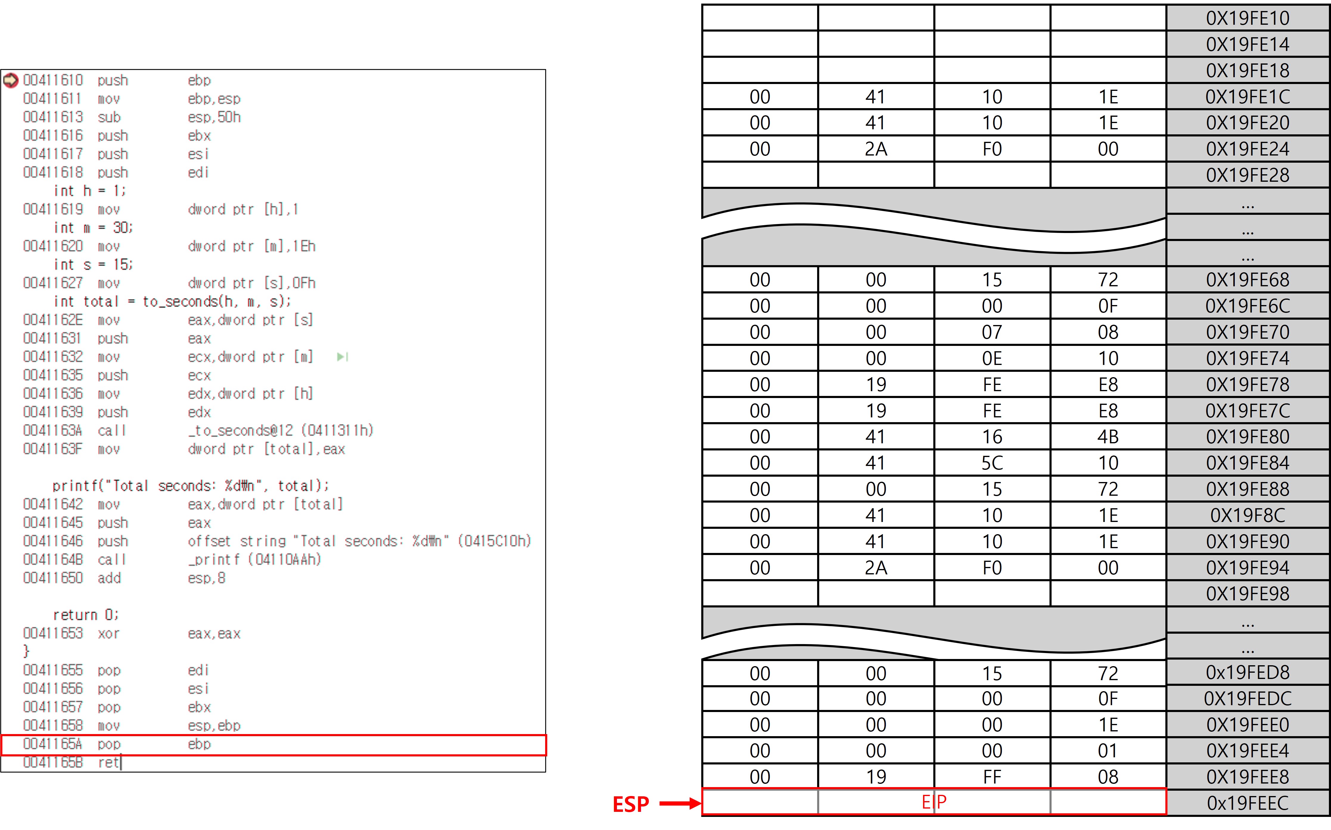 pop ebp 명령은 스택에 저장되어 있던 SFP를 다시 EBP에 복원하는 역할을 한다. 이 명령어 하나로 EBP는 to_seconds 함수 호출 이전의 main의 EBP 값이 복원되고, ESP는 자동으로 반환 주소(EIP)를 가리키게 되어 복귀 준비까지 완료된다. 매우 간단한 코드 한 줄 인데 치밀하고 정교한 설계 덕분에 이 짧은 코드가 수행하는 논리적 동작은 엄청나다.