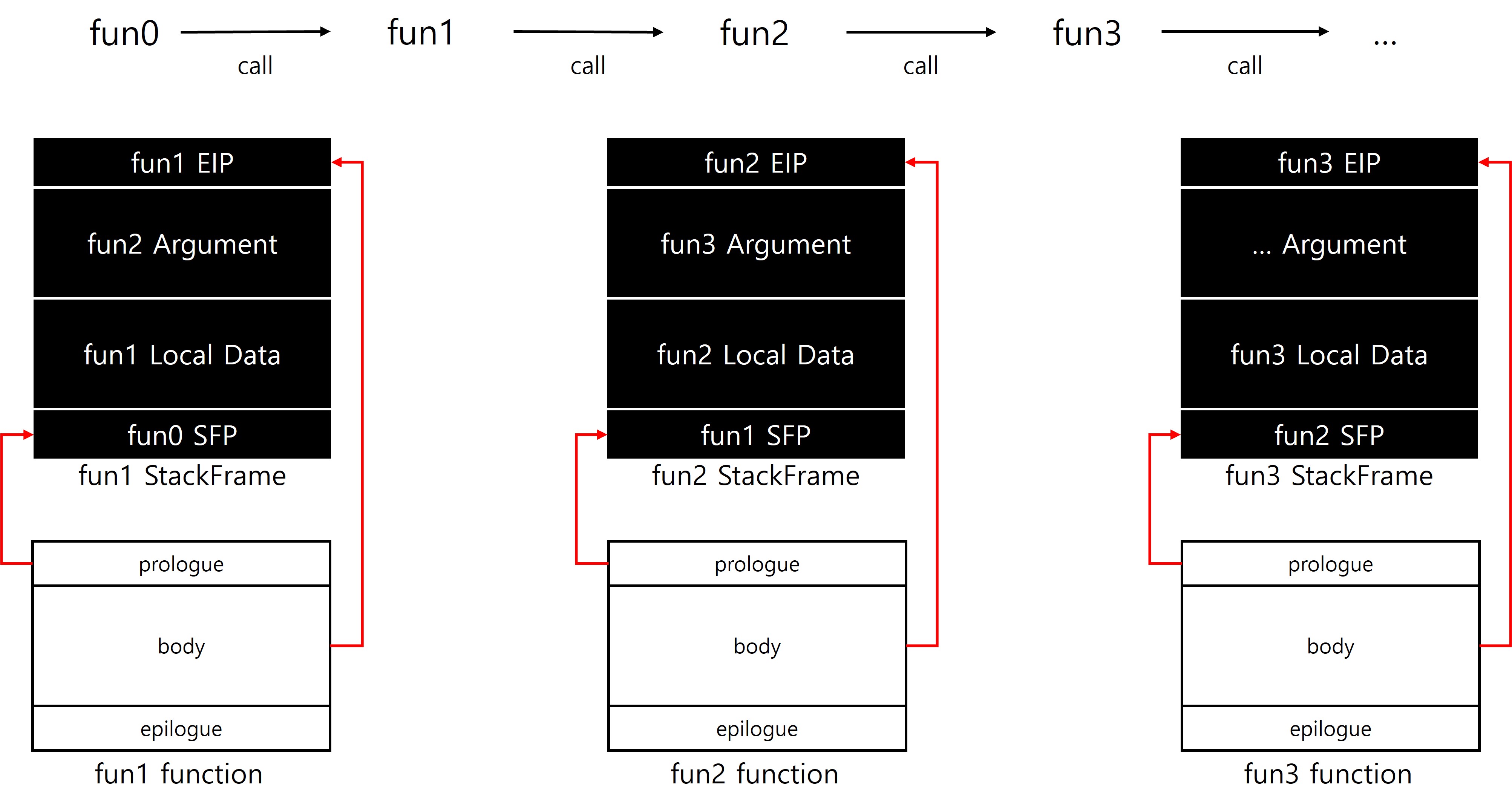 | 에필로그 (epilogue) | (leave) mov esp, ebp pop ebp (ret <n>) pop eip add esp, <n> jmp eip |