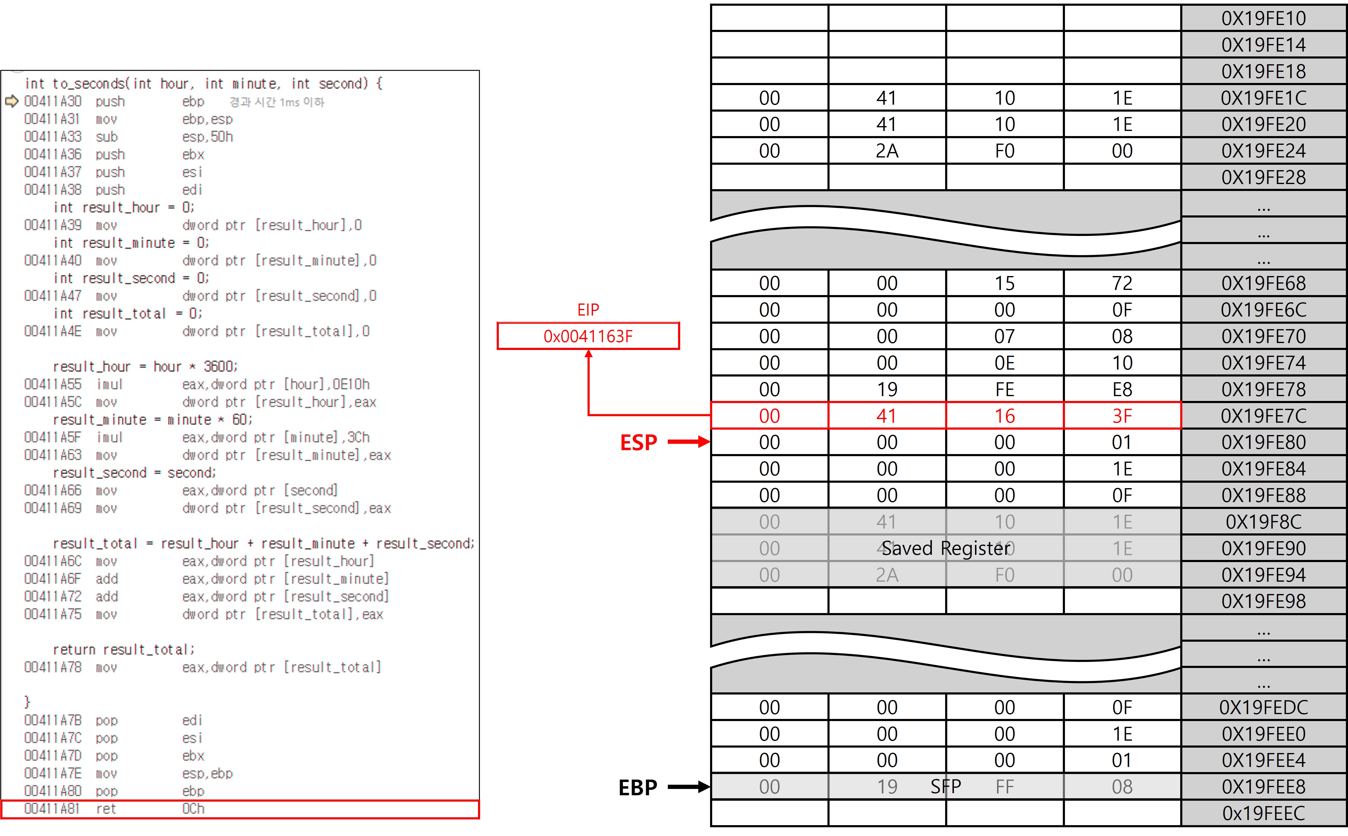 함수에 전달할 인자를 모두 스택에 push 한 뒤, to_seconds 함수를 호출하는 동작으로 이어진다. call 명령어에는 중요한 동작이 포함되어 있는데, 현재 EIP값(다음에 실행될 명령의 주소 0x41163F)을 스택에 push한다는 점이다. 이 값은 함수 실행이 끝난 후 에필로그 단계에서 ret 명령을 통해 복원되며, 호출 지점으로 정확히 되돌아가기 위해 사용된다. EIP와 SFP는 스택 프레임에서 매우 중요한 요소로, 함수 호출 이전 상태를 기억하는 일종의 세이브 포인트 역할을 한다.