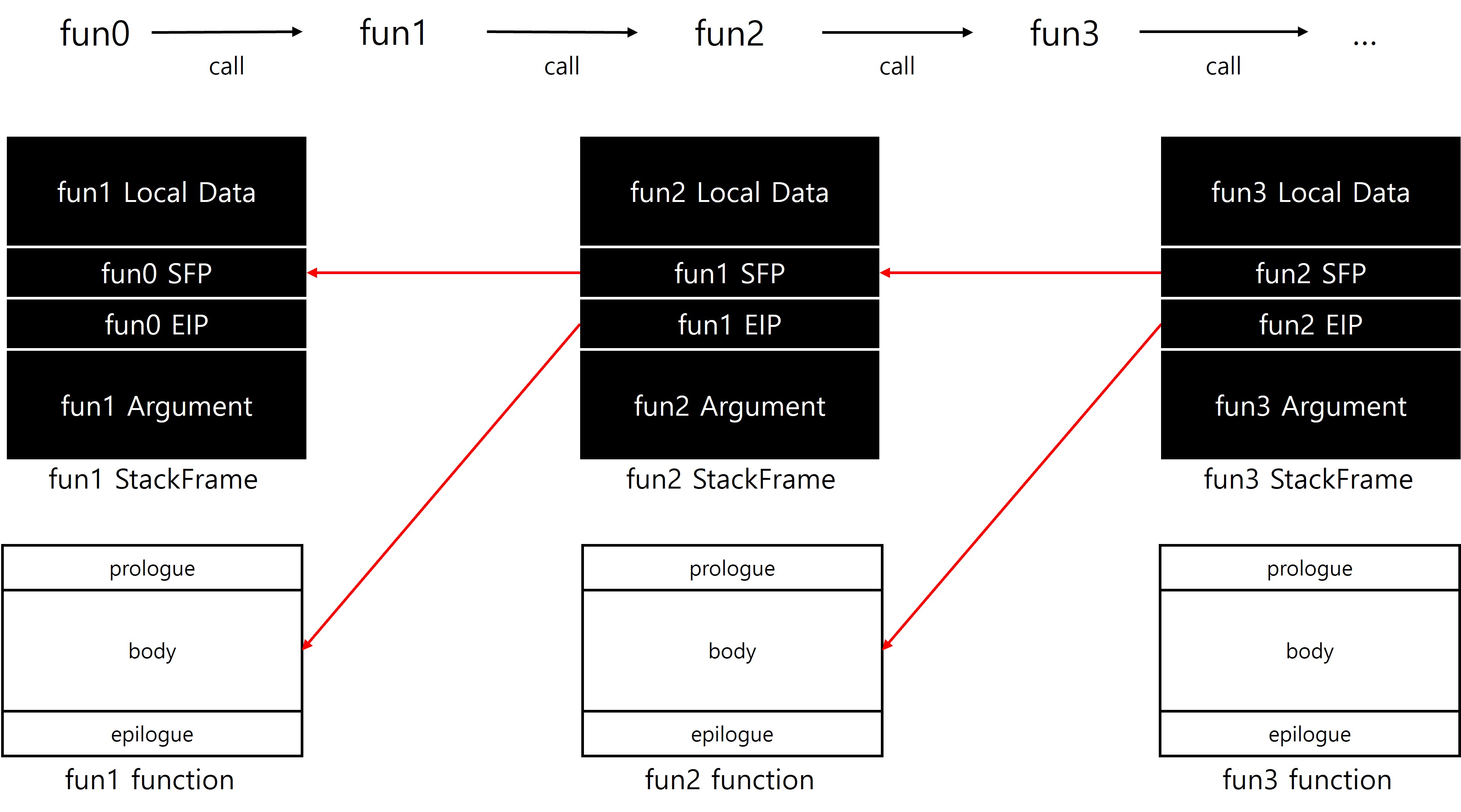 위 이미지는 main→printf→fun1→fun2→fun3로 깊어졌다가, fun3→fun2→fun1→main 으로 거꾸로 되돌아오는 함수의 호출 및 복귀 과정이다. 서로 다른 함수가 연쇄적으로 호출되는데 어떻게 꼬이지 않고 CPU는 다음에 돌아올 주소를 기억할까? 이 질문의 답을 확인하려면 같은 코드를 어셈블리언어로 들여다봐야 한다.