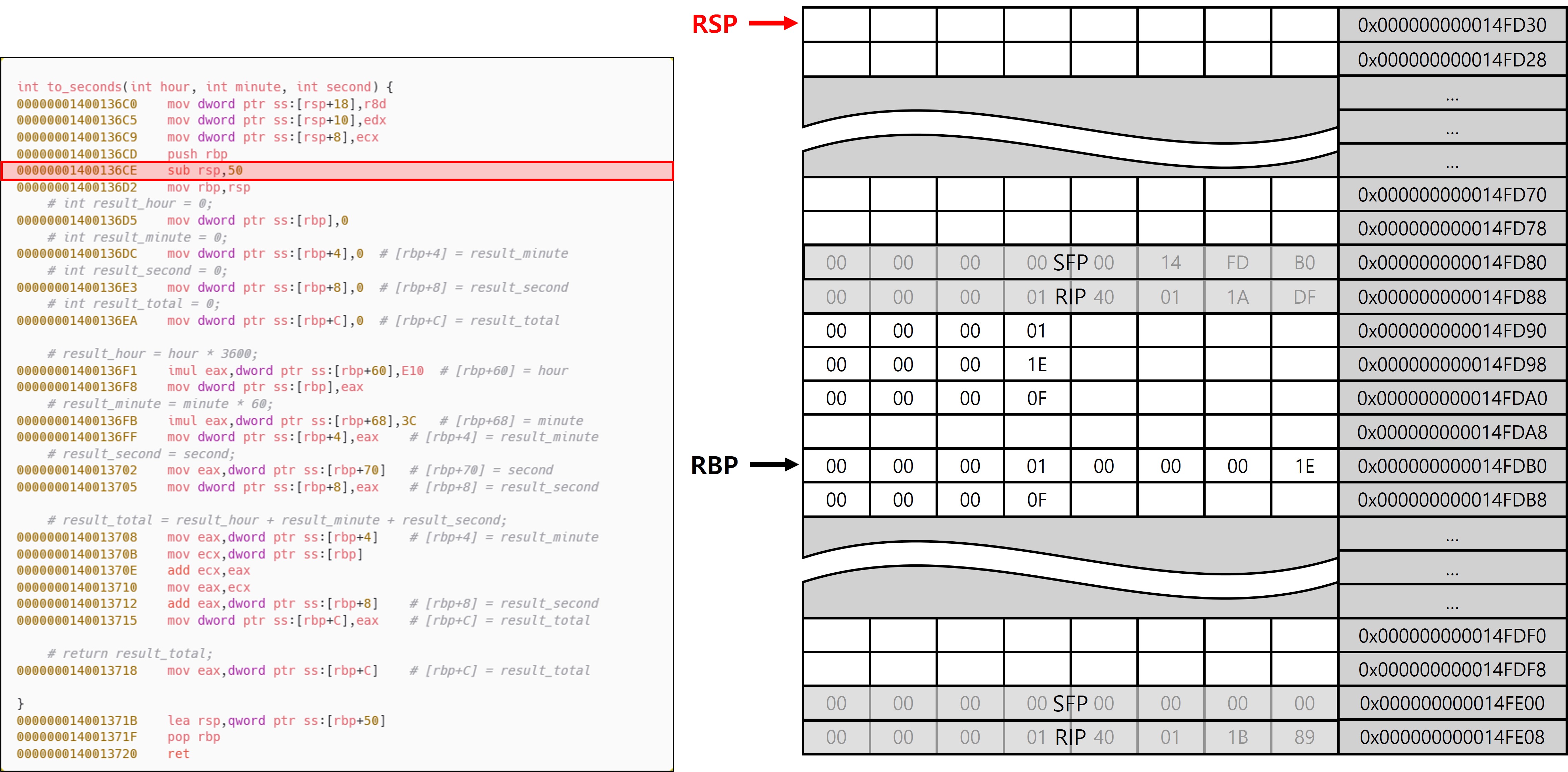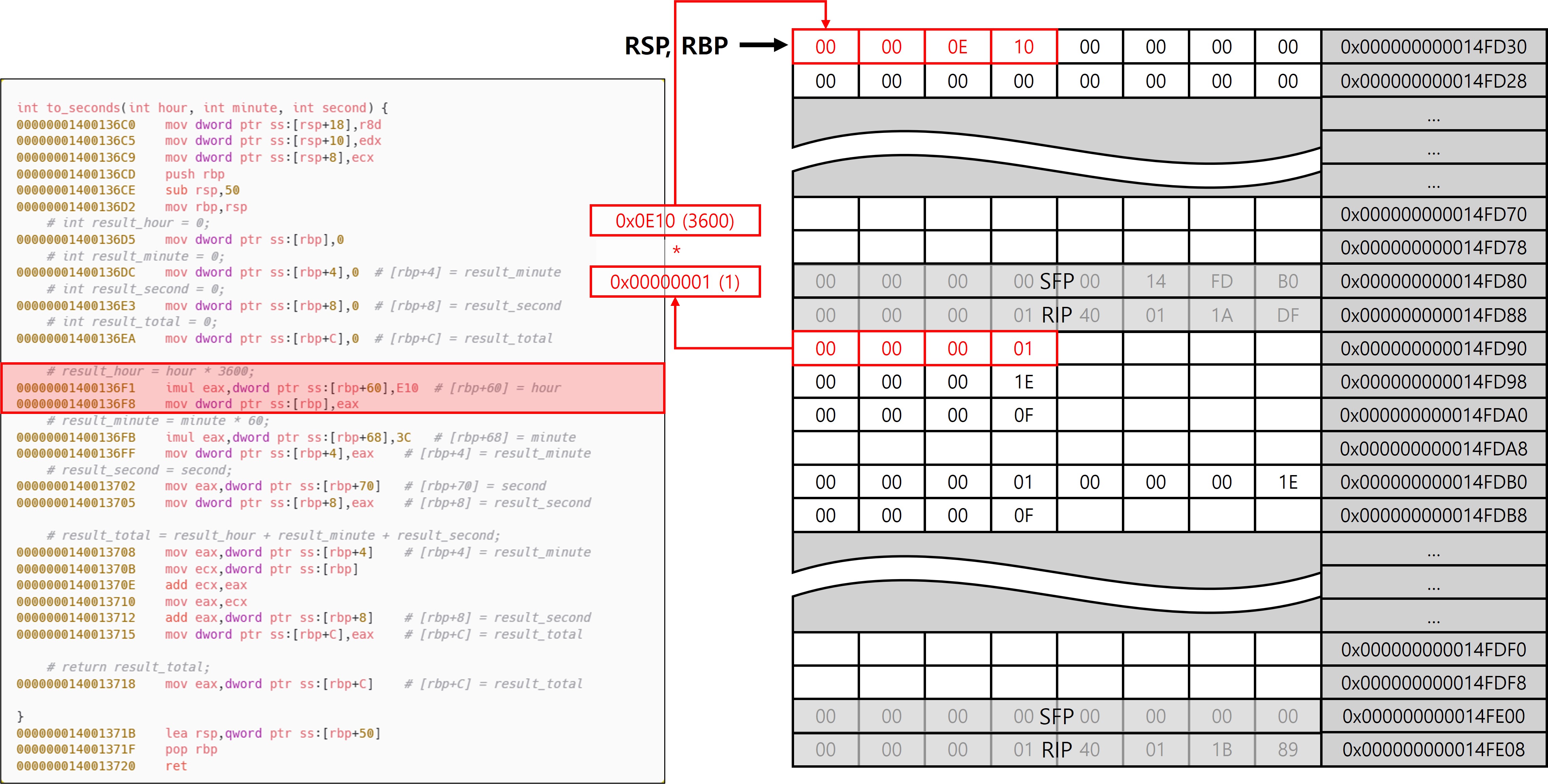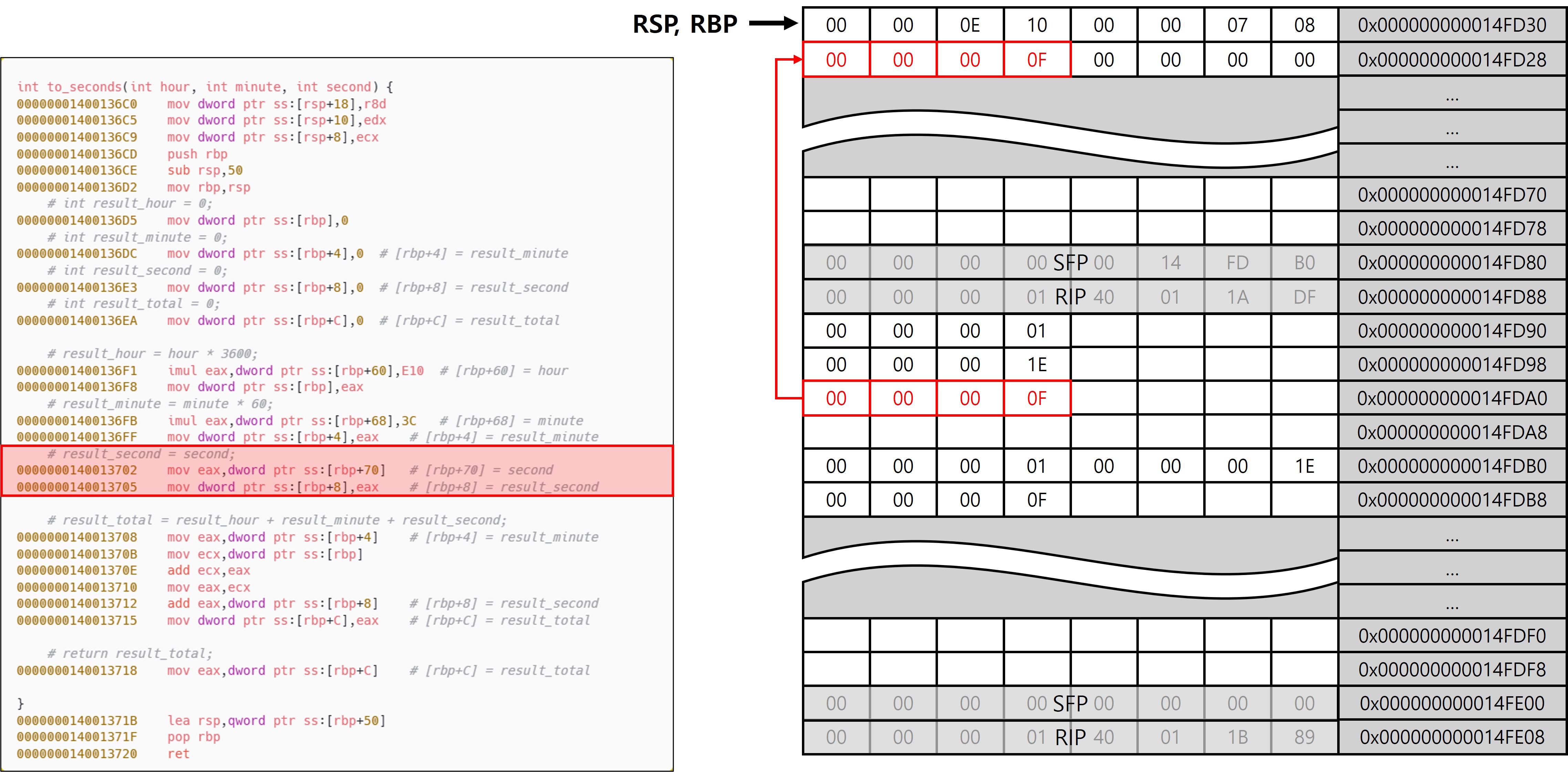 다만 main 함수와의 차이점은 to_seconds가 Leaf 함수라는 점에 있다. Leaf 함수는 내부에서 다른 함수를 호출하지 않기 때문에, Shadow Space를 추가로 확보할 필요가 없으며, 호출 인자와 로컬 변수 영역을 분리할 필요도 없다. 이로 인해 프레임 구성에서도 차이가 발생하며, 그 결과 서로 다른 패턴(Leaf, Non-Leaf)이 등장하는 것이다. to_seconds에서는 함수 진입 직후 설정된 RSP와 RBP가 동일한 위치를 가리키고 있는 것을 확인할 수 있는데, 이는 to_seconds가 Leaf 함수이기 때문이다. 또한 x32에서 EBP가 SFP를 가리키고 있는 구조와 전혀 다른 모습이 나타난다는 것을 확인할 수 있다(이 동작이 가능한 이유는 이후 에필로그에서 설명).