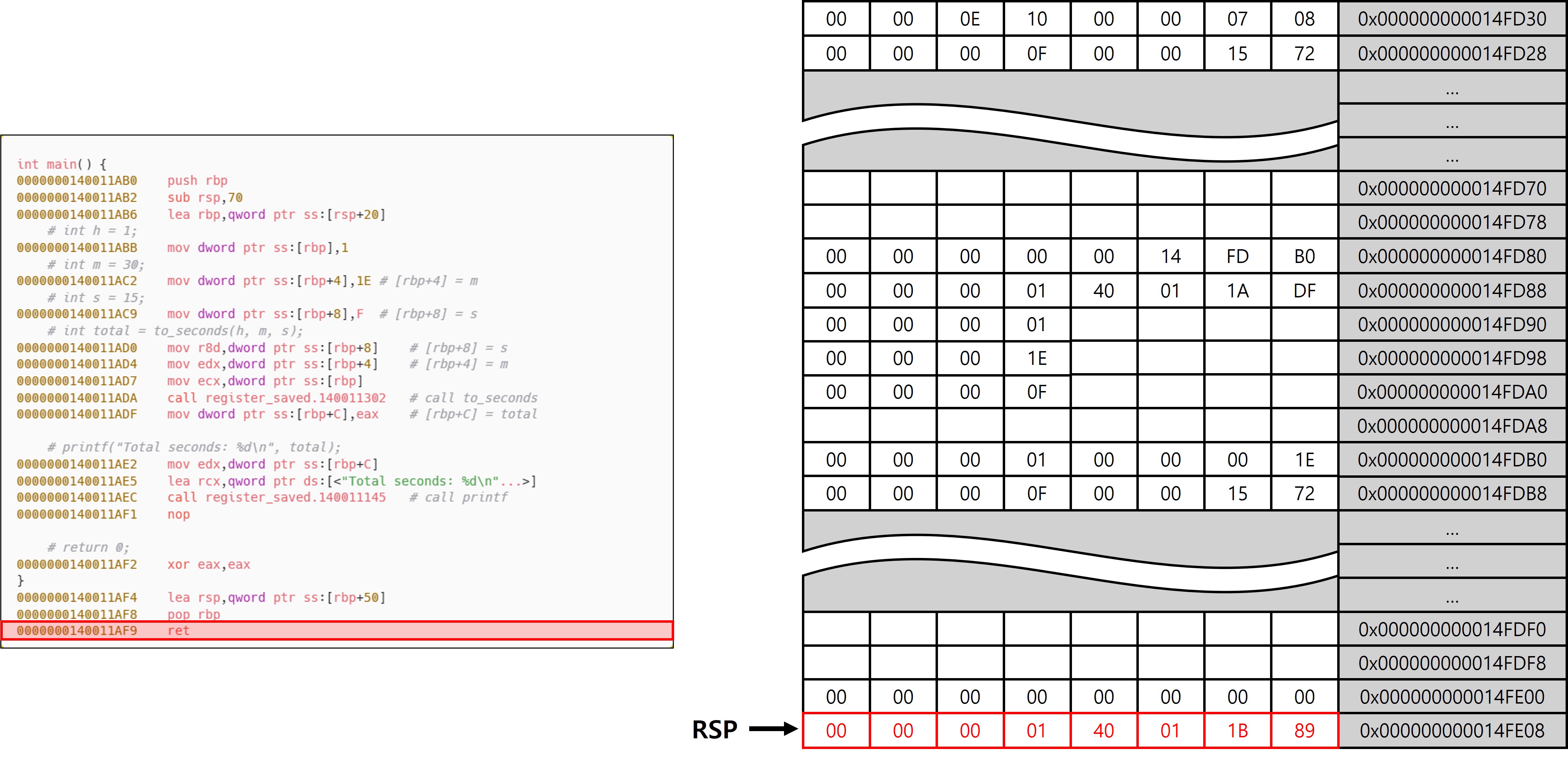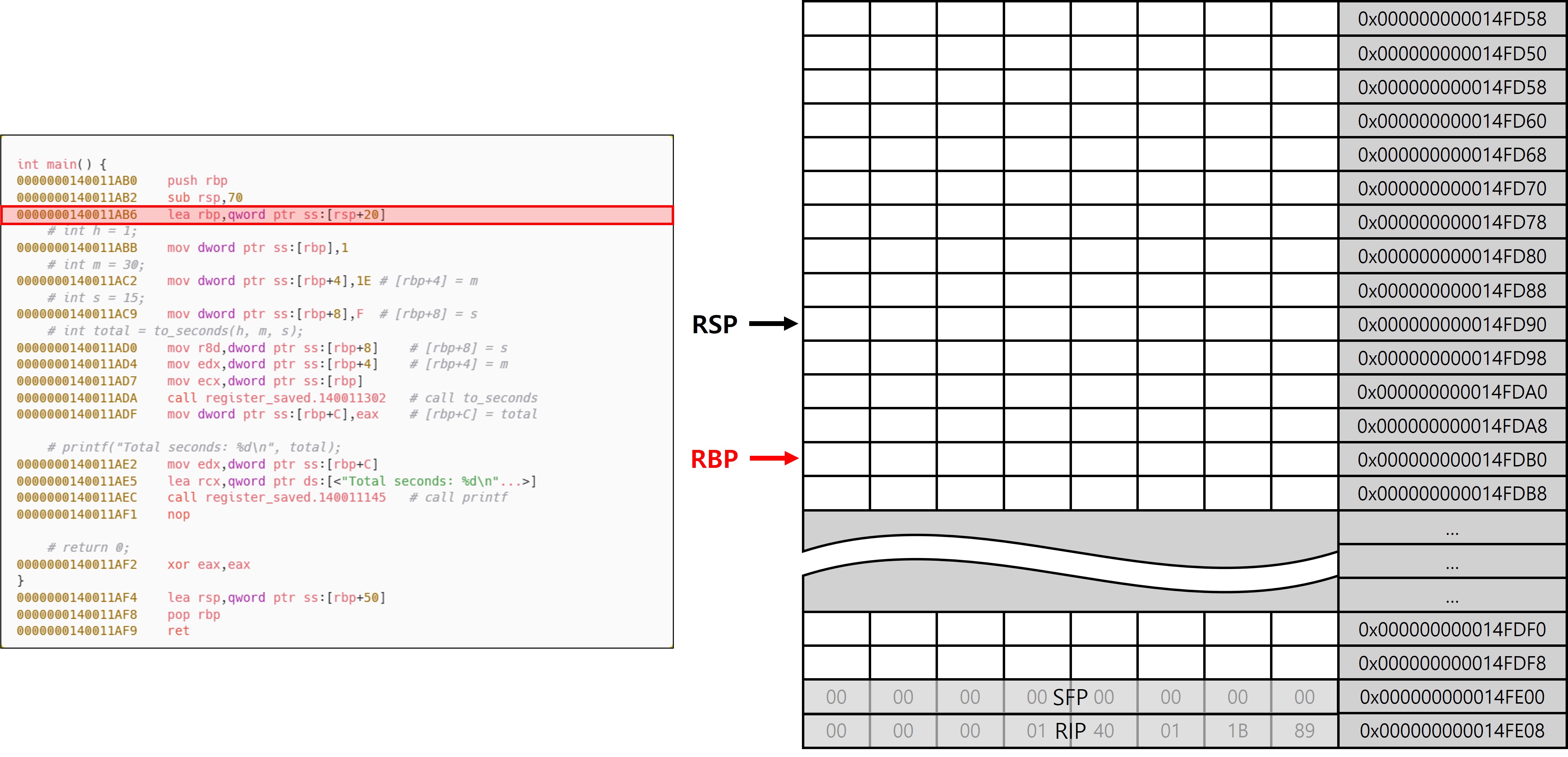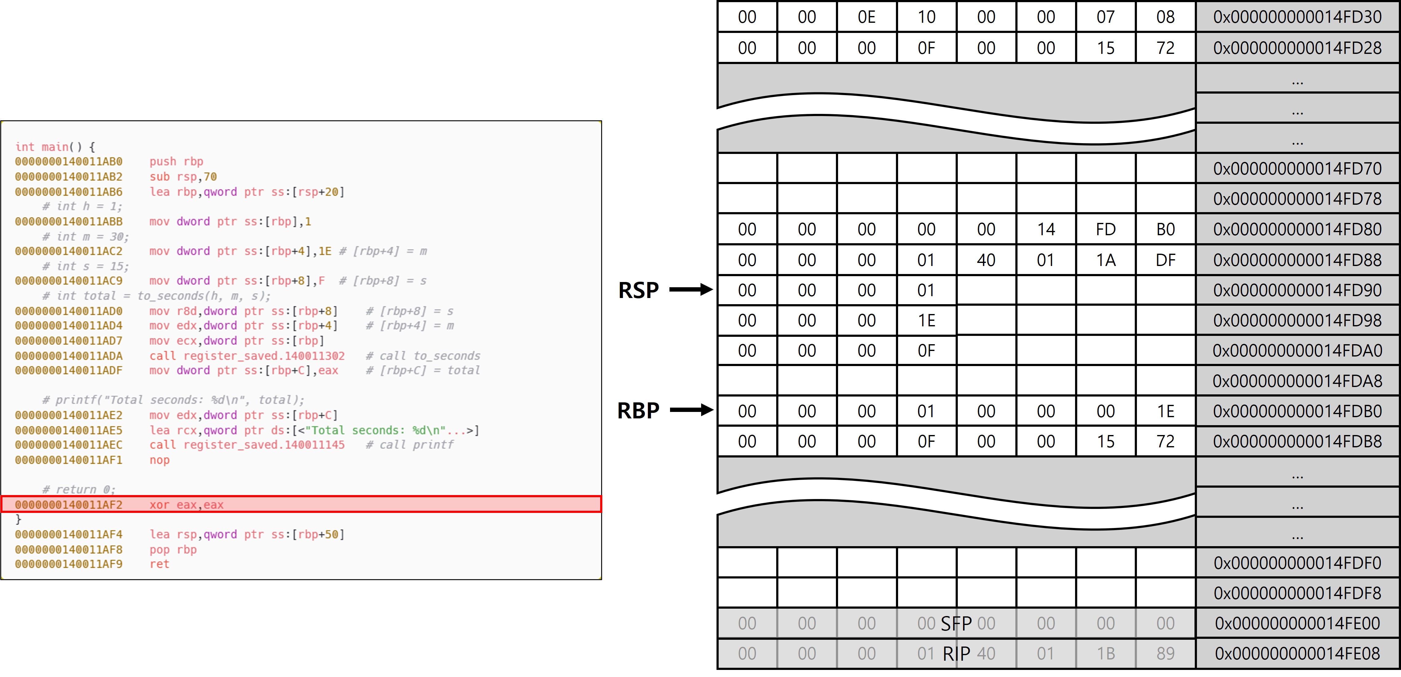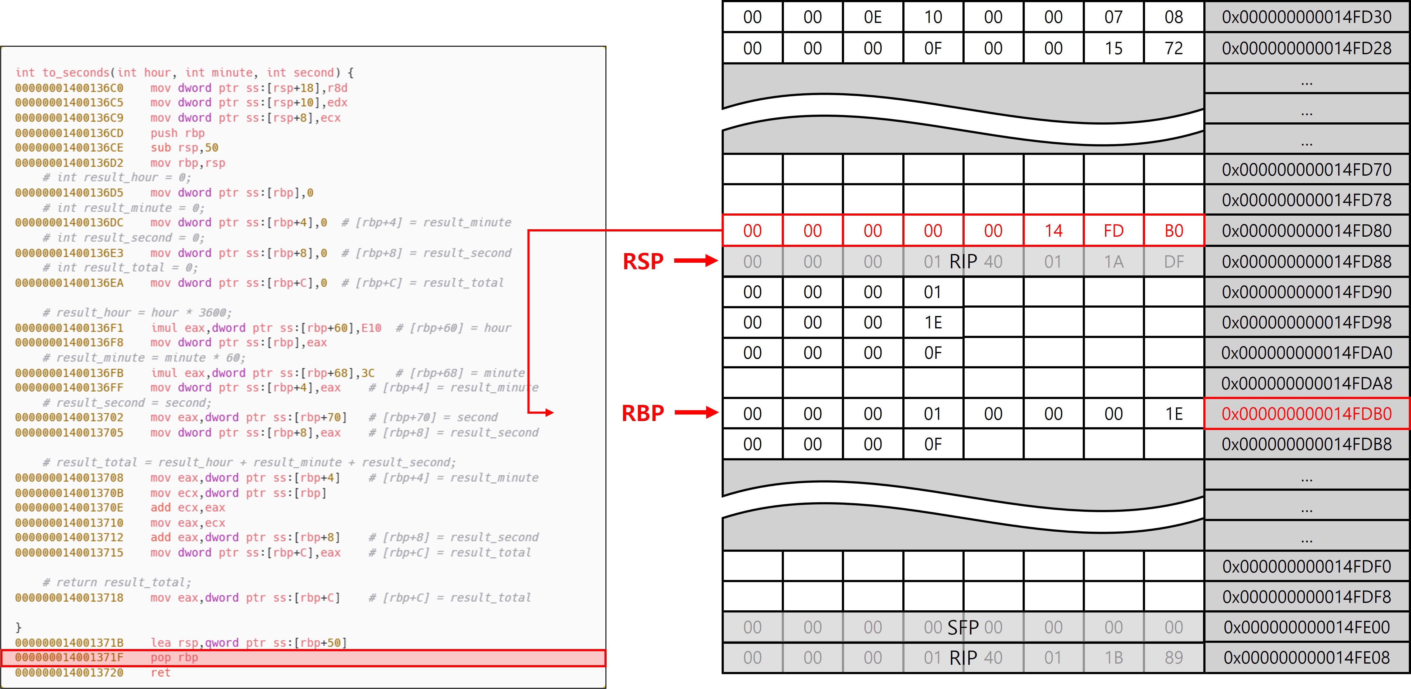 다만 main 함수와의 차이점은 to_seconds가 Leaf 함수라는 점에 있다. Leaf 함수는 내부에서 다른 함수를 호출하지 않기 때문에, Shadow Space를 추가로 확보할 필요가 없으며, 호출 인자와 로컬 변수 영역을 분리할 필요도 없다. 이로 인해 프레임 구성에서도 차이가 발생하며, 그 결과 서로 다른 패턴(Leaf, Non-Leaf)이 등장하는 것이다. to_seconds에서는 함수 진입 직후 설정된 RSP와 RBP가 동일한 위치를 가리키고 있는 것을 확인할 수 있는데, 이는 to_seconds가 Leaf 함수이기 때문이다. 또한 x32에서 EBP가 SFP를 가리키고 있는 구조와 전혀 다른 모습이 나타난다는 것을 확인할 수 있다(이 동작이 가능한 이유는 이후 에필로그에서 설명).