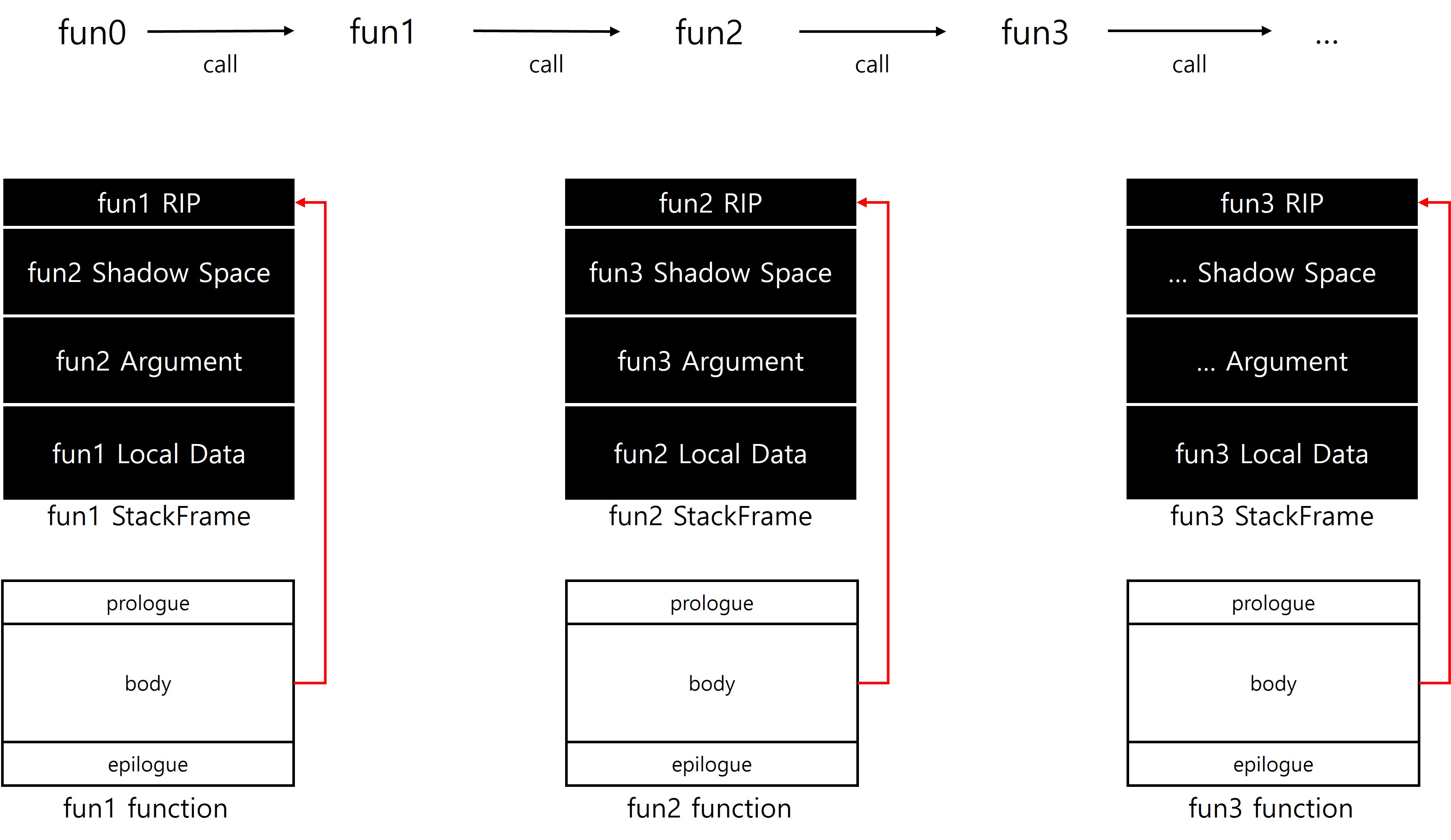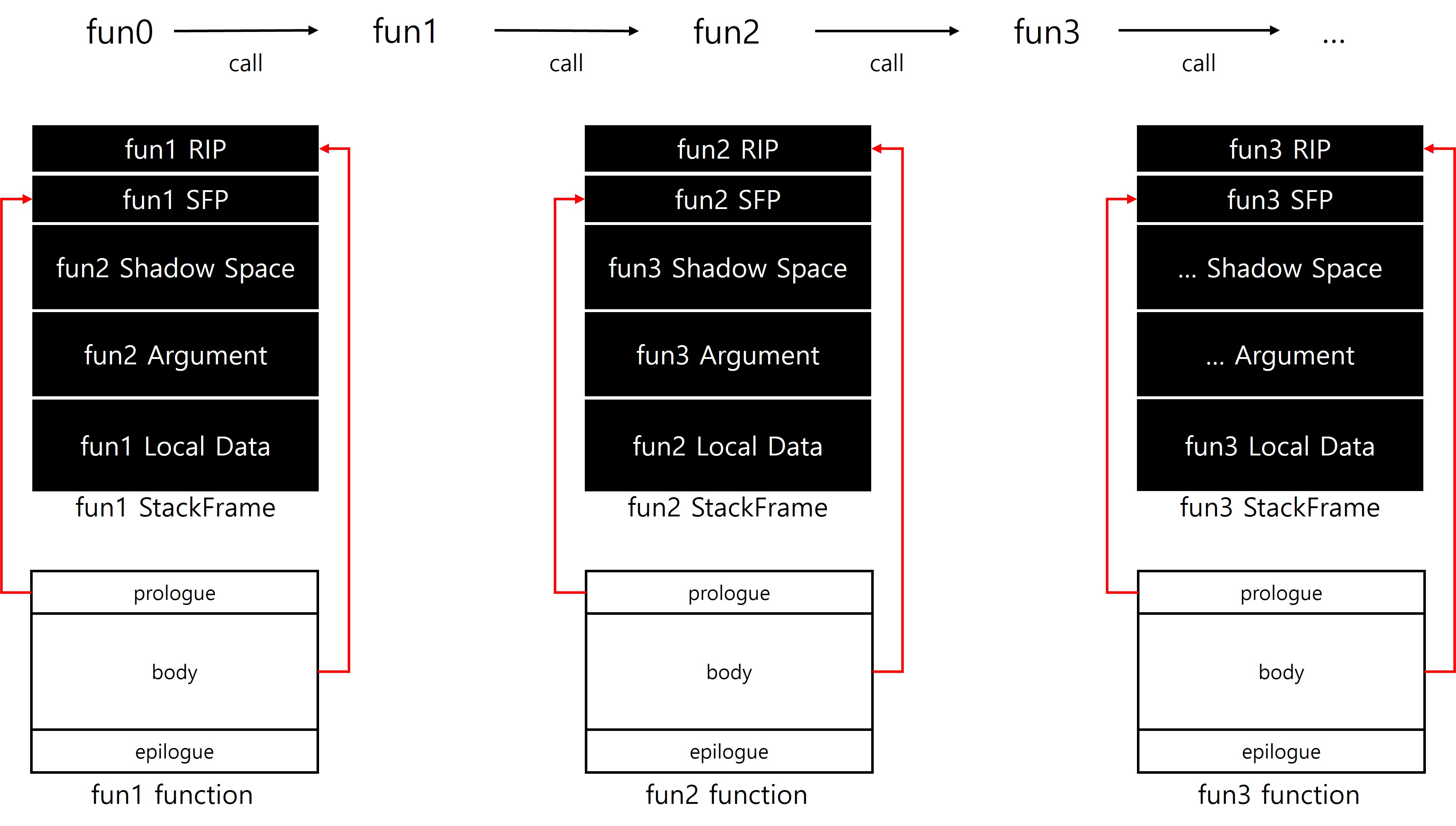 함수의 시작에 붙는 패턴은 프롤로그(prologue), 끝 부분에 붙는 패턴은 에필로그(epilogue)로 구분할 수 있으며, 직접 작성한 코드의 로직은 두 패턴 사이의 바디(body)에 위치하게 된다. 이러한 공통된 틀은 컴파일 단계에서 컴파일러가 자동으로 삽입한다. 덕분에 모든 함수가 일관된 스택 프레임을 유지할 수 있게 되며 중첩 호출 상황에서도 데이터와 복귀 주소가 안전하게 보호된다. x86에서는 함수의 프롤로그와 에필로그가 상대적으로 정형화된 형태로 나타난다. 그러나 x64에서는 프롤로그와 에필로그의 형태가 하나로 고정되지 않으며, 함수의 특성이나 컴파일 옵션, 최적화 여부 등에 따라 여러 가지 방식으로 다양하게 구성될 수 있다.
