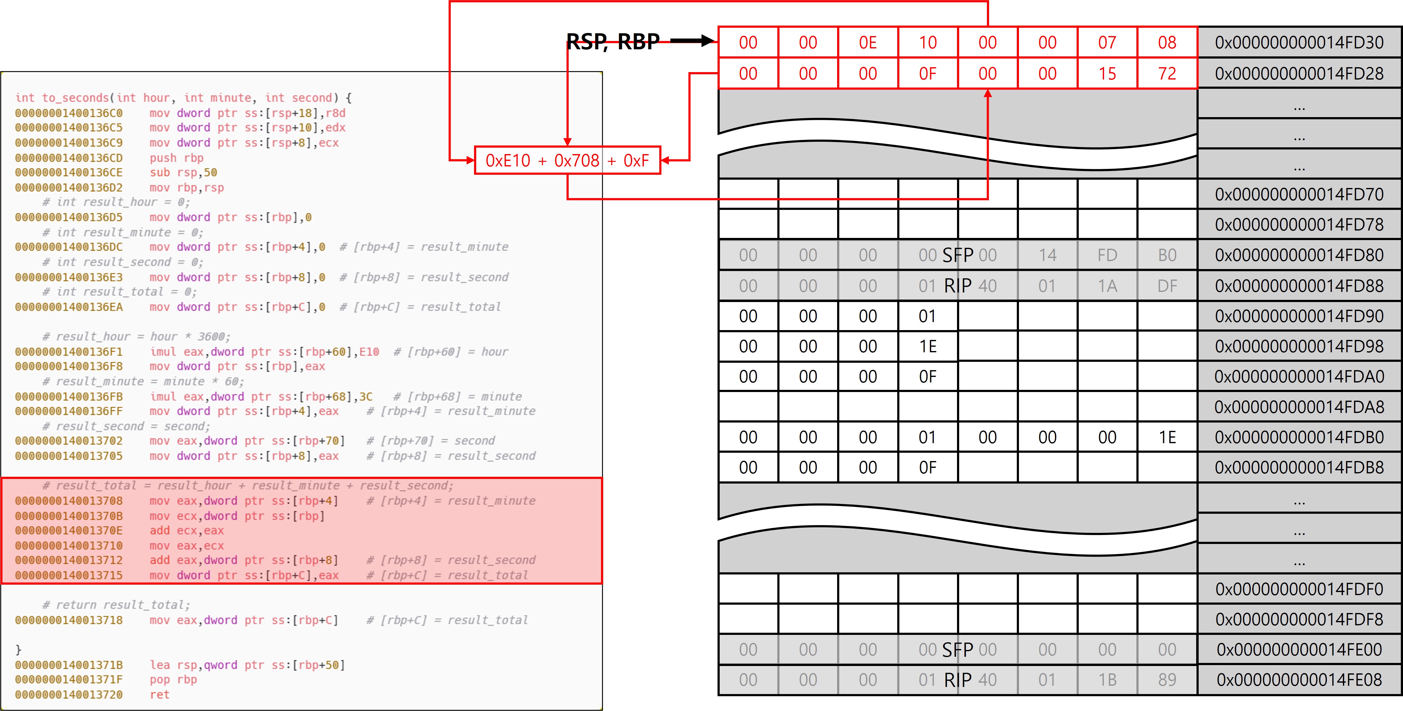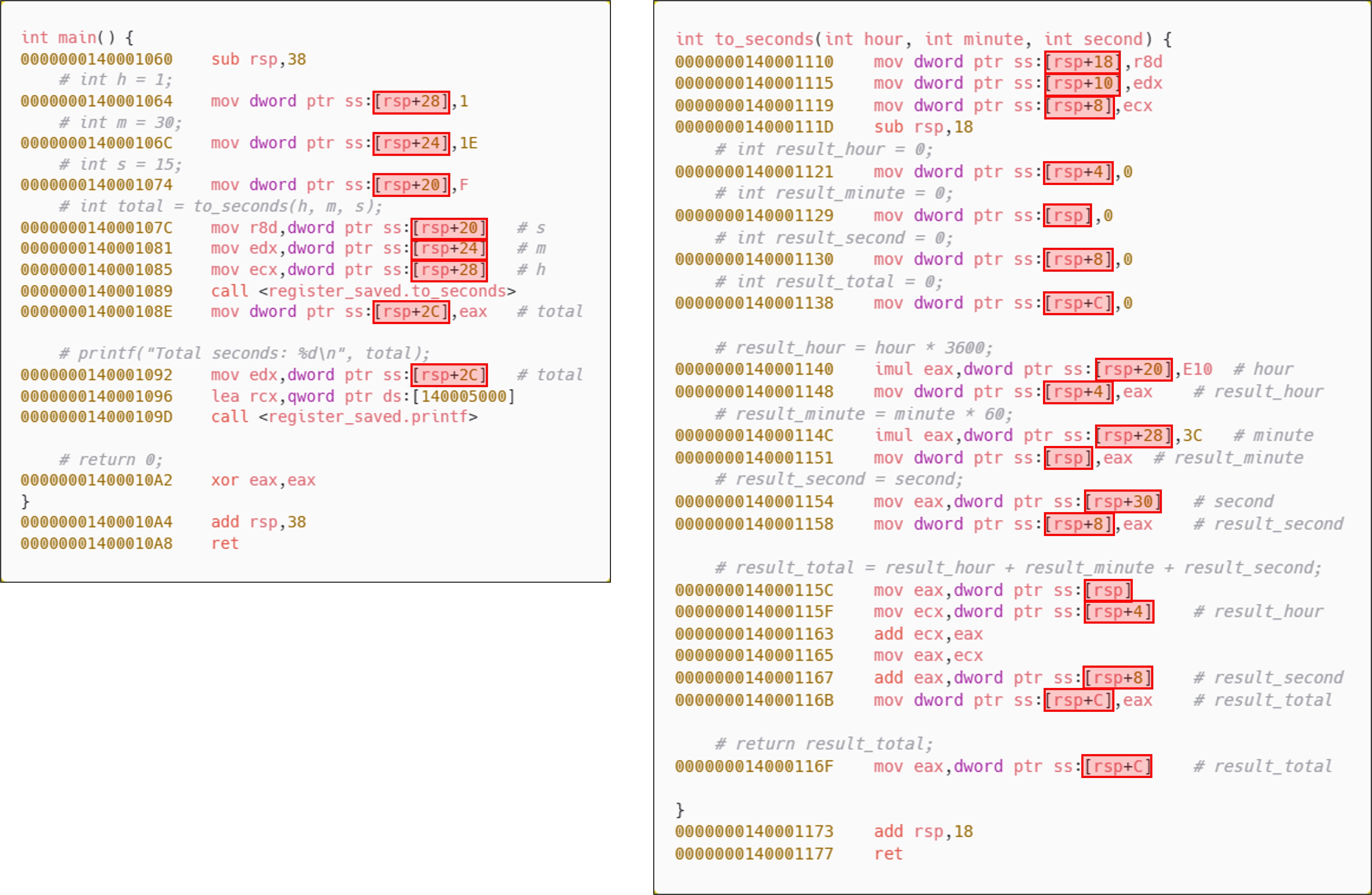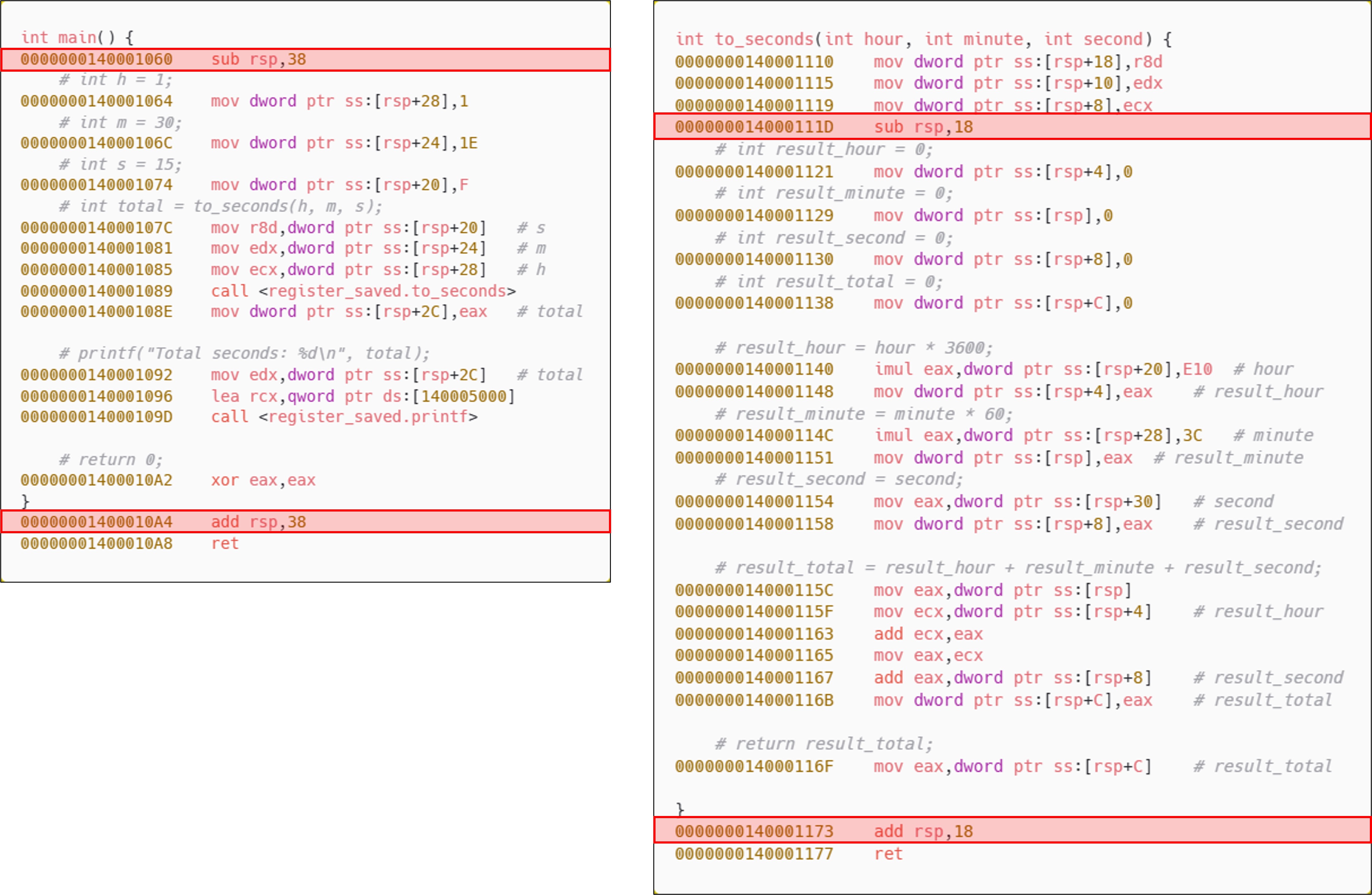 to_seconds 함수를 호출하기 전, 각각의 로컬 변수(h, m ,s)를 레지스터에 담고 있다. x64 함수 호출 규약에 따라 정수형 인자는 순서대로 ECX, EDX, R8, R9 레지스터를 통해 전달되며, 이 예제에서는 인자가 3개이므로 ECX, EDX, R8이 사용된다. x32환경과 달리, x64에서는 하나의 고정된 호출 규약이 적용되어 함수마다 호출 방식이 달라지지 않는다. 이때, 인자의 자료형에 따라 레지스터 그룹이 구분되는데, 정수형은 위와 같은 범용 레지스터, 부동소수점형은 XMM0~XMM3 등의 레지스터를 통해 전달된다.