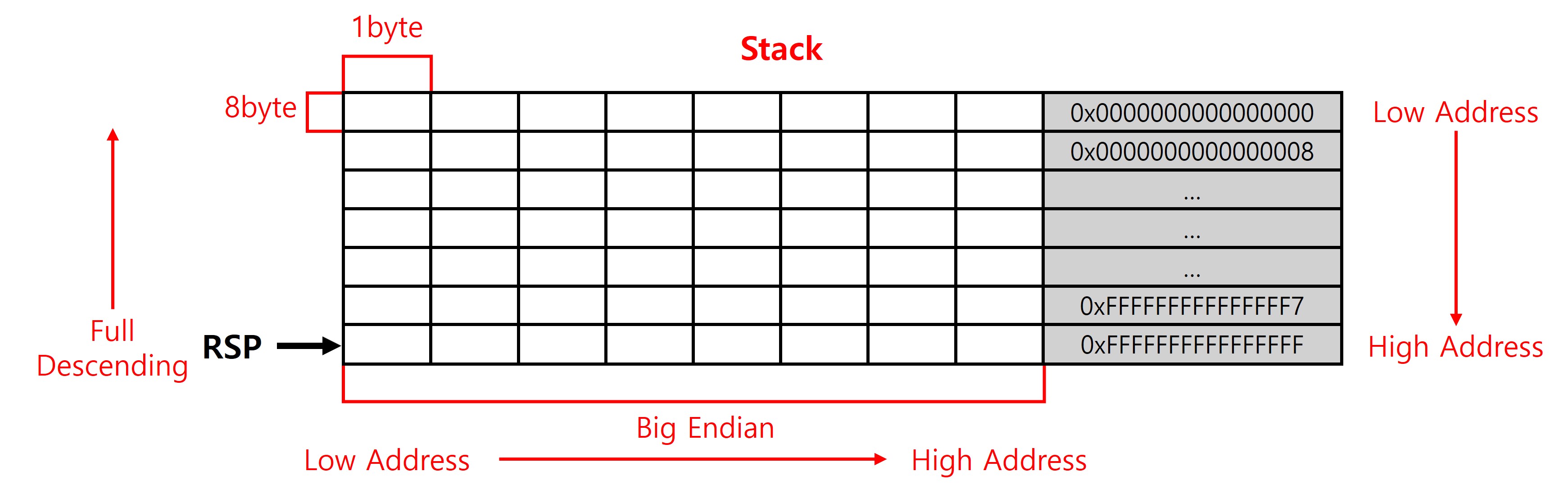 x64 환경을 고려해 스택은 Full Descending 방식으로 동작하므로, ESP 레지스터는 데이터를 저장할 때마다 더 낮은 주소로 이동한 뒤 해당 위치에 값을 기록한다. 낮은주소와 높은 주소의 위치는 위와 같으며 주소의 간격은 8byte다. 데이터를 기록할 때는 가독성을 고려해 빅엔디언 방식을 적용한다.