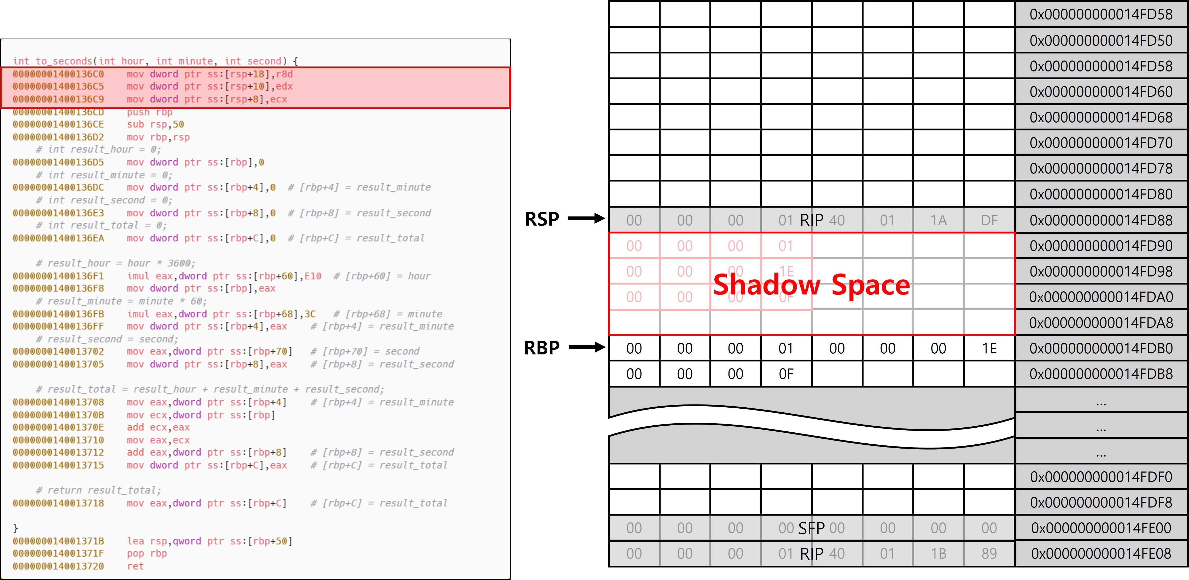 to_seconds 함수의 프롤로그 부분에서 인자로 전달받은 레지스터 ECX, EDX, E8을 다시 스택에 저장하는 동작을 한다. 이 동작은 인자의 백업을 위해 사용될 수도 있지만, 해당 예제 코드에서는 최적화를 적용하지 않았기 때문에 디버깅 용이성을 위해 나타난 코드이다. 이 영역은 main에서 미리 확보한 Shadow Space 영역이다.