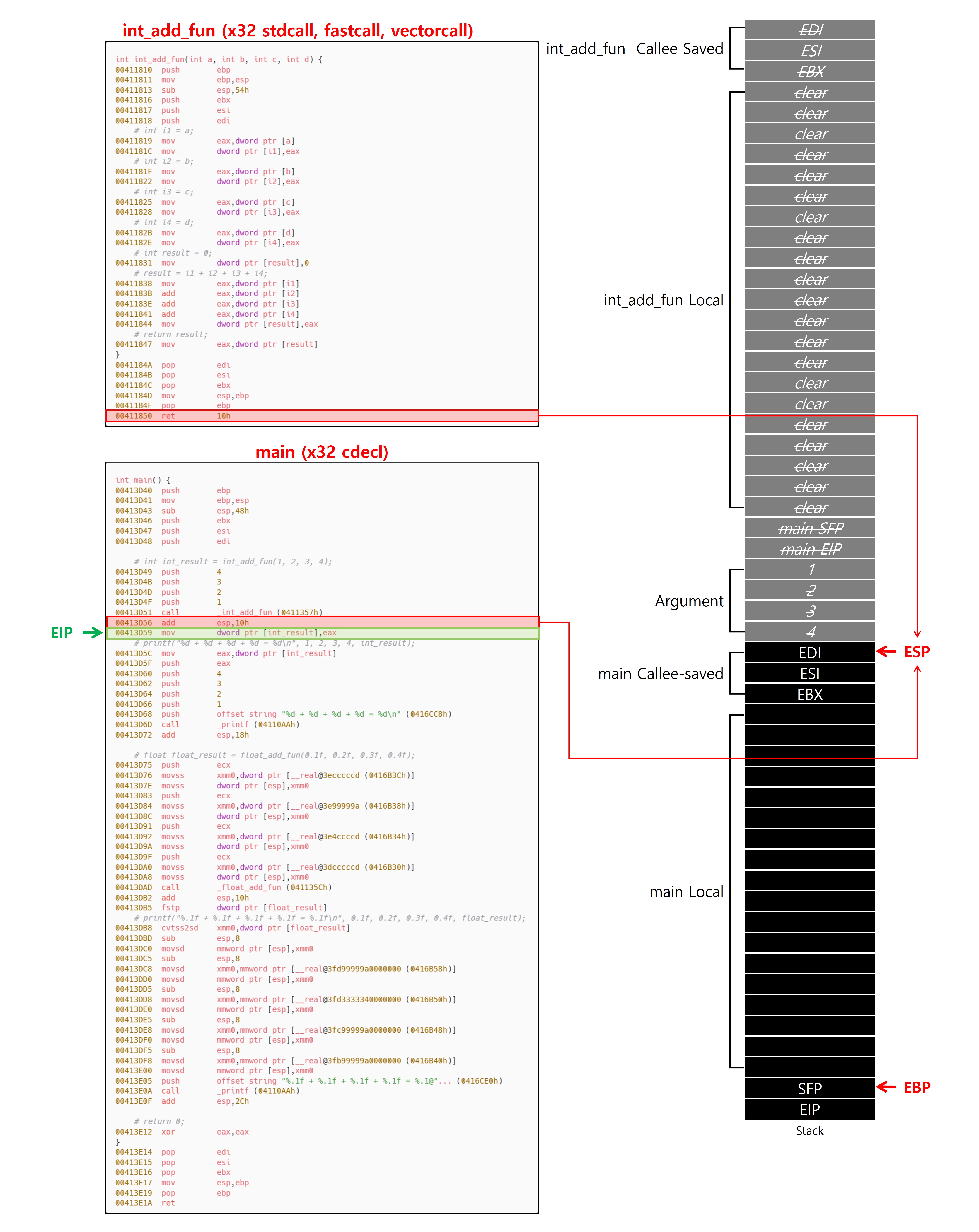 | __vectorcall (x32) | Callee(피호출자) | Callee (피호출자) | Callee Epilogue |