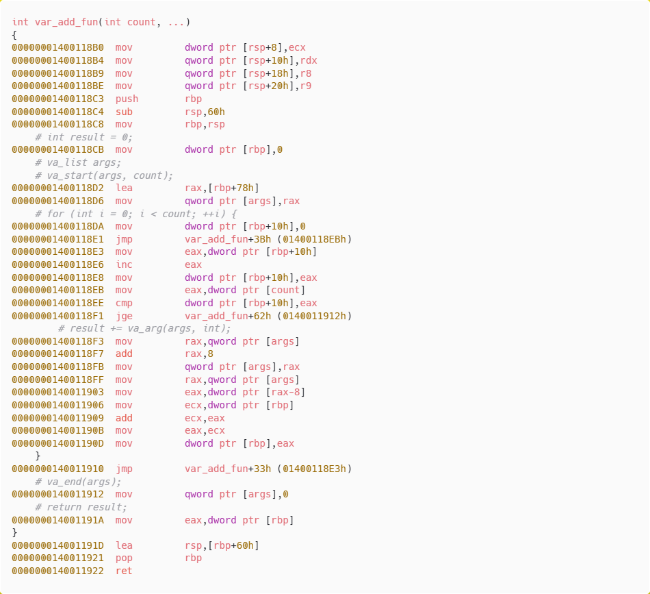 var_add_fun 함수가 동작하는 방식은 매우 단순하다. va_start를 통해 가변인자의 시작 주소(count 다음 인자)를 지정한다. 이후 count 만큼 인자를 result에 누산한다.