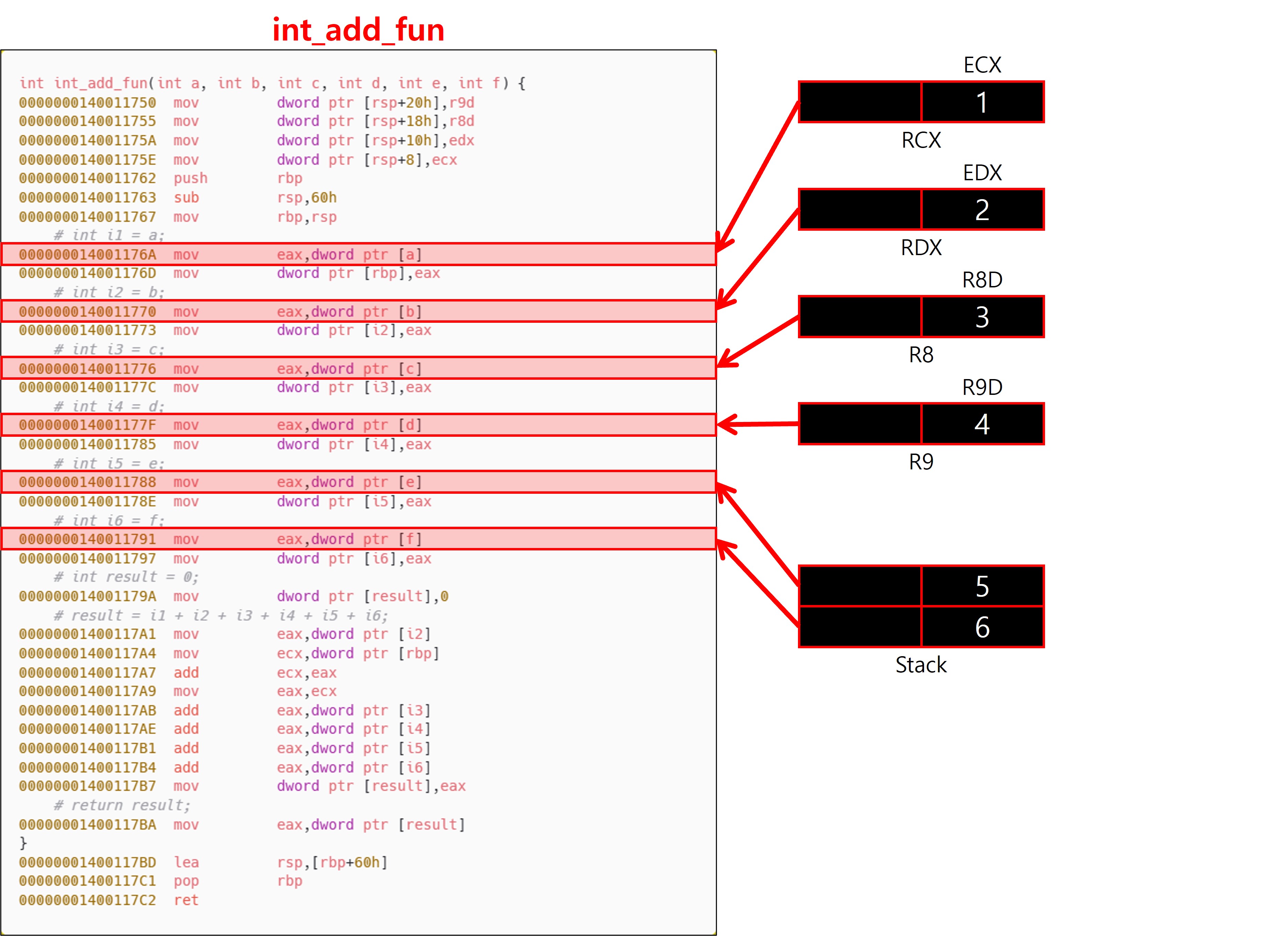 정수형 및 포인터형 인수는 RCX, RDX, R8, R9 레지스터를 사용하며, 이 네 개를 초과하는 인수는 스택을 통해 전달된다.