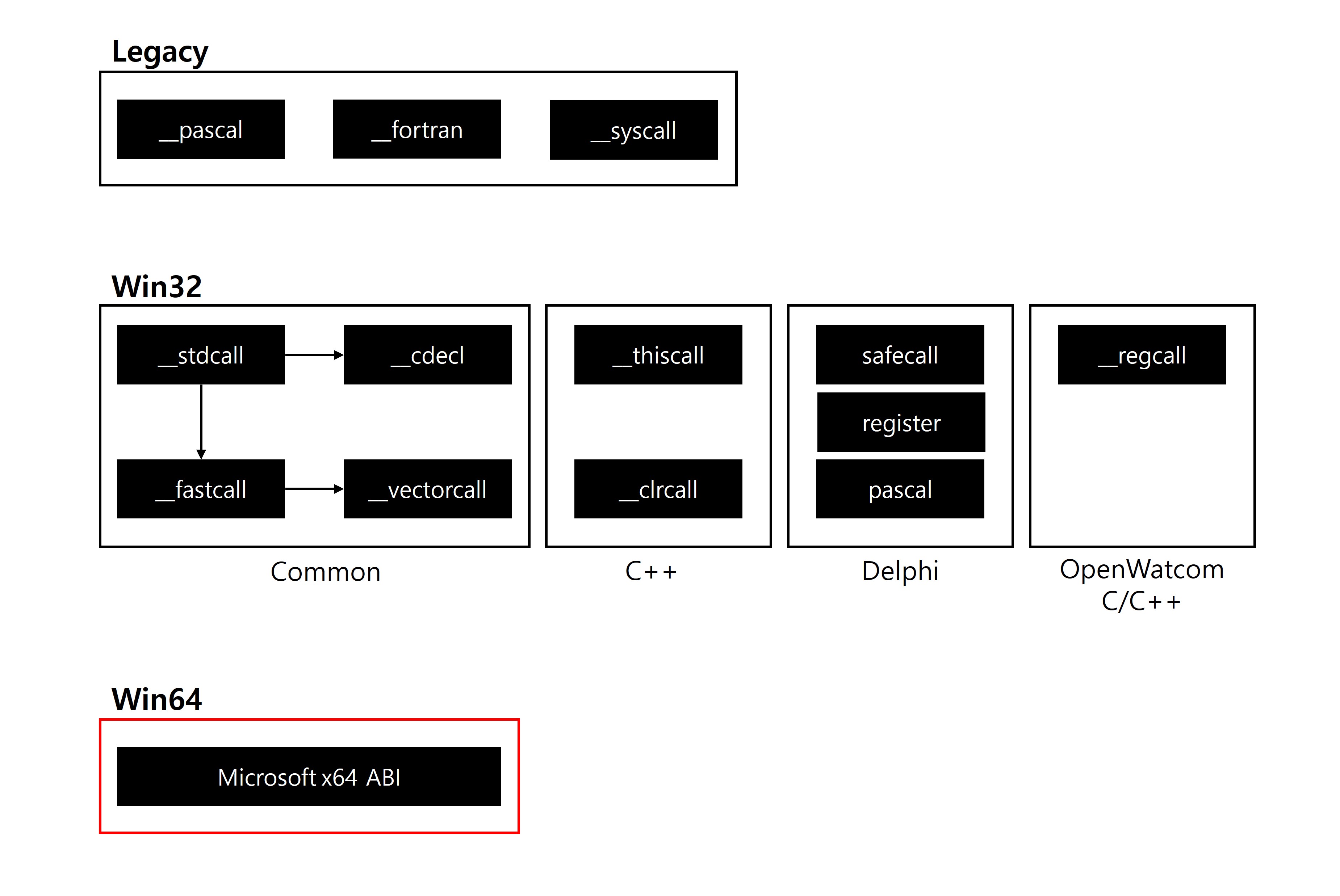Windows x32에는 __cdecl, __stdcall, __fastcall, __vectorcall 등 다수의 호출규약이 공존했으나, x64로의 전환 과정에서 플랫폼별로 하나의 표준 호출규약만 남도록 설계가 단순화되었다. Windows x64 calling convention이라는 단일 규격을 강제함으로써 모듈이 모두 동일한 규칙을 공유한다. 이러한 통일은 레지스터 전달로 인한 성능 이점과 시스템 수준 최적화를 가능케 하며, 하나의 규약만 알면 모든 바이너리가 호환된다는 이점을 얻게 되었다.