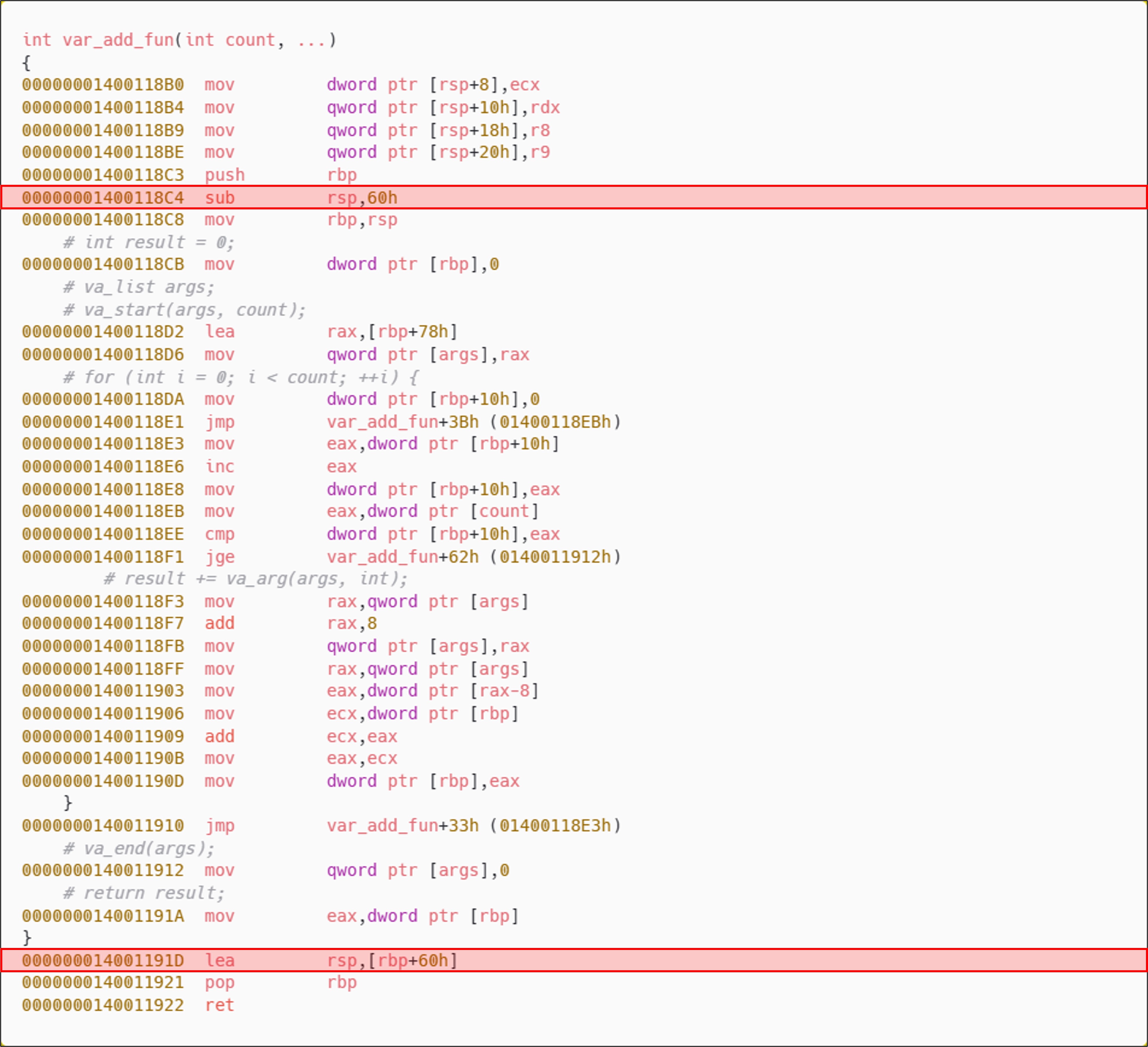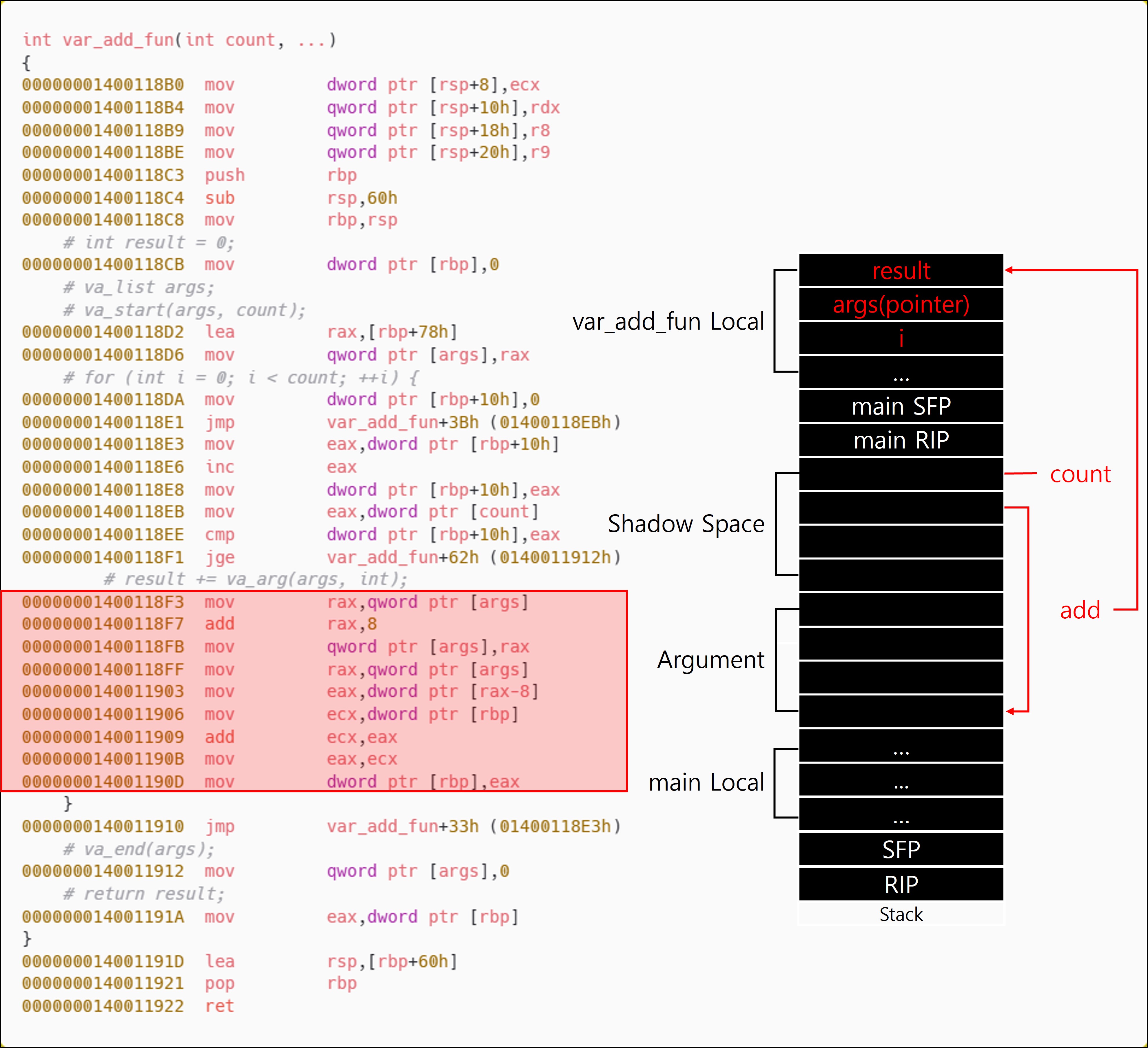 인자의 수가 가변적이라 하더라도 인자는 Caller(호출자)에 의해 호출 시점에 스택에 적재되므로 Callee(피호출자)의 로컬 영역 크기에는 영향을 미치지 않는다. 즉, var_add_fun(int count, ...)과 같은 가변 인자 함수에서 count 이후의 가변 인자들은 단순히 기존 스택 프레임 상의 인자 영역을 순회하는 방식으로 동작한다. 따라서 가변 인자의 존재 여부나 개수는 함수 내부에서 별도의 로컬 변수를 추가로 선언하거나, 스택 공간을 새로 확보해야 하는 요소가 아니므로 Callee(피호출자)의 로컬 영역 크기는 일정하게 유지된다. x32도 같은 방식으로 동작한다.
