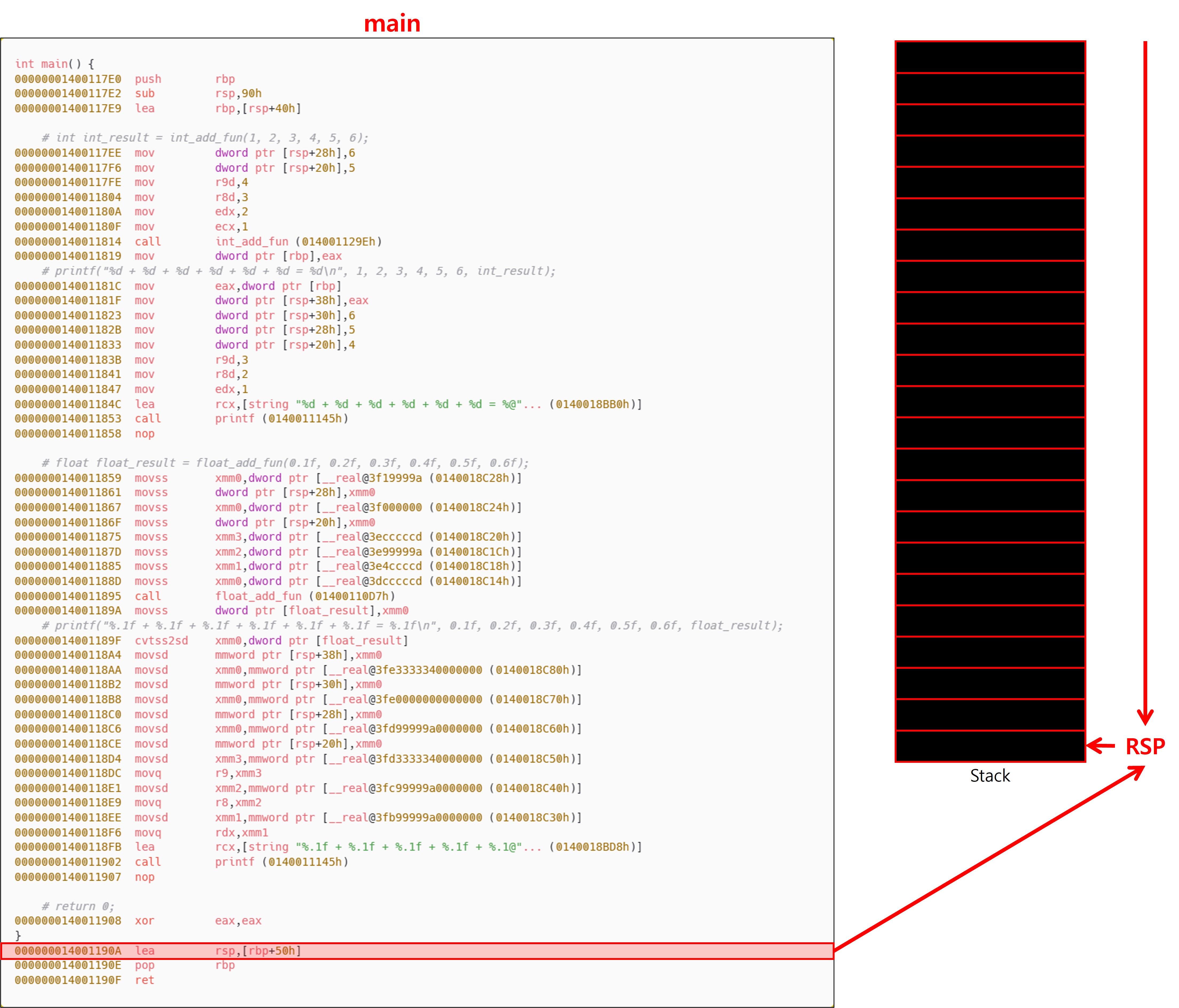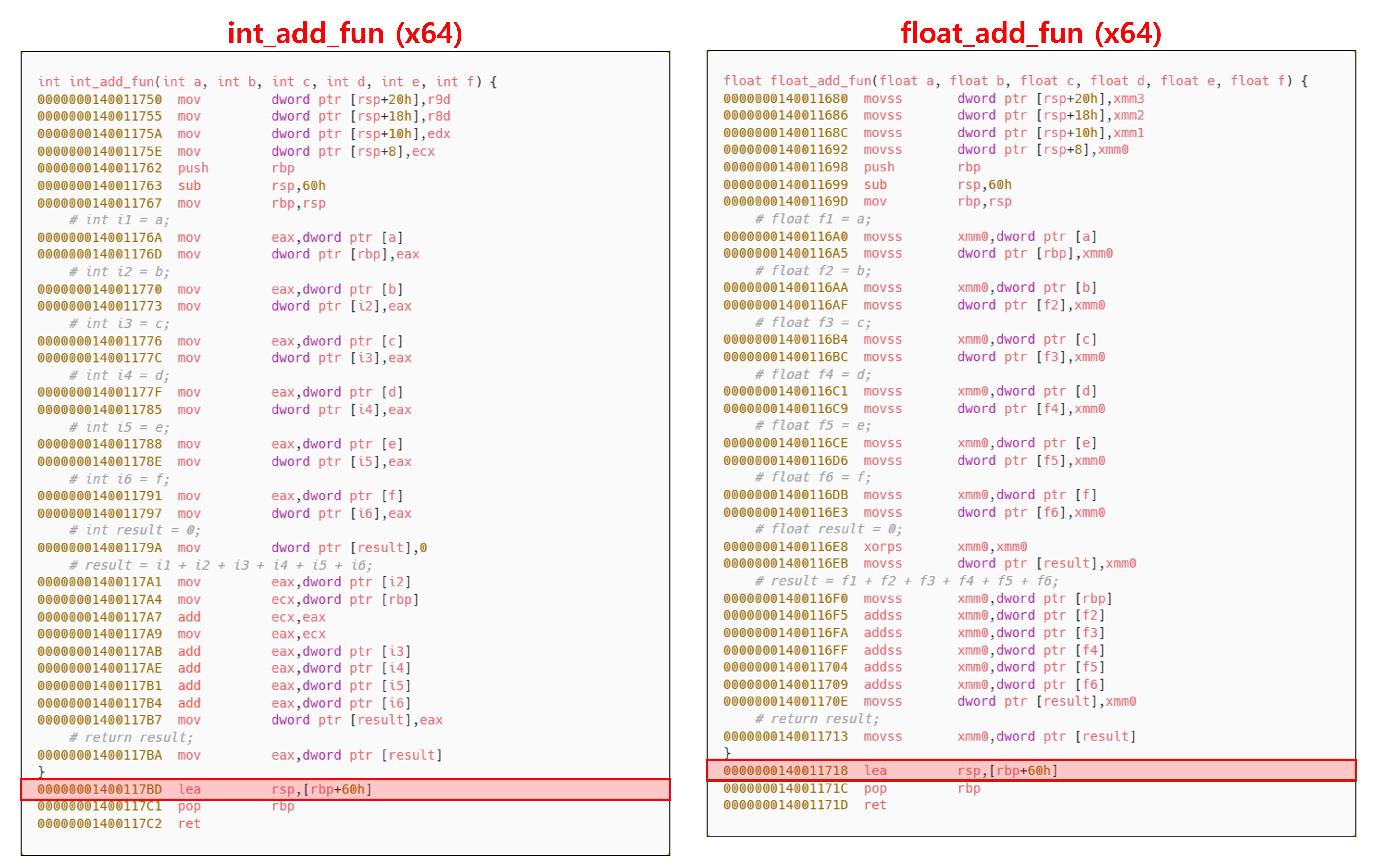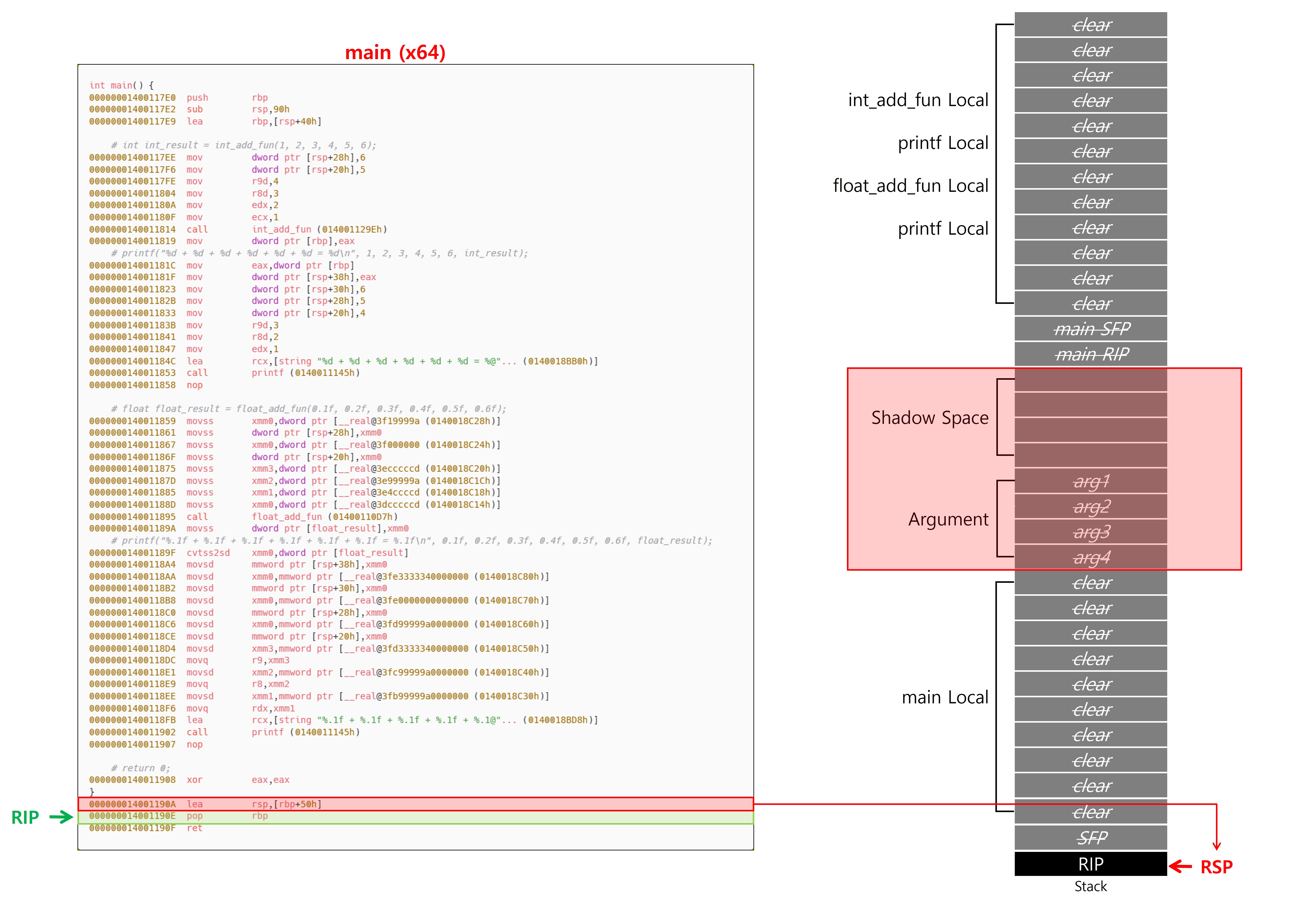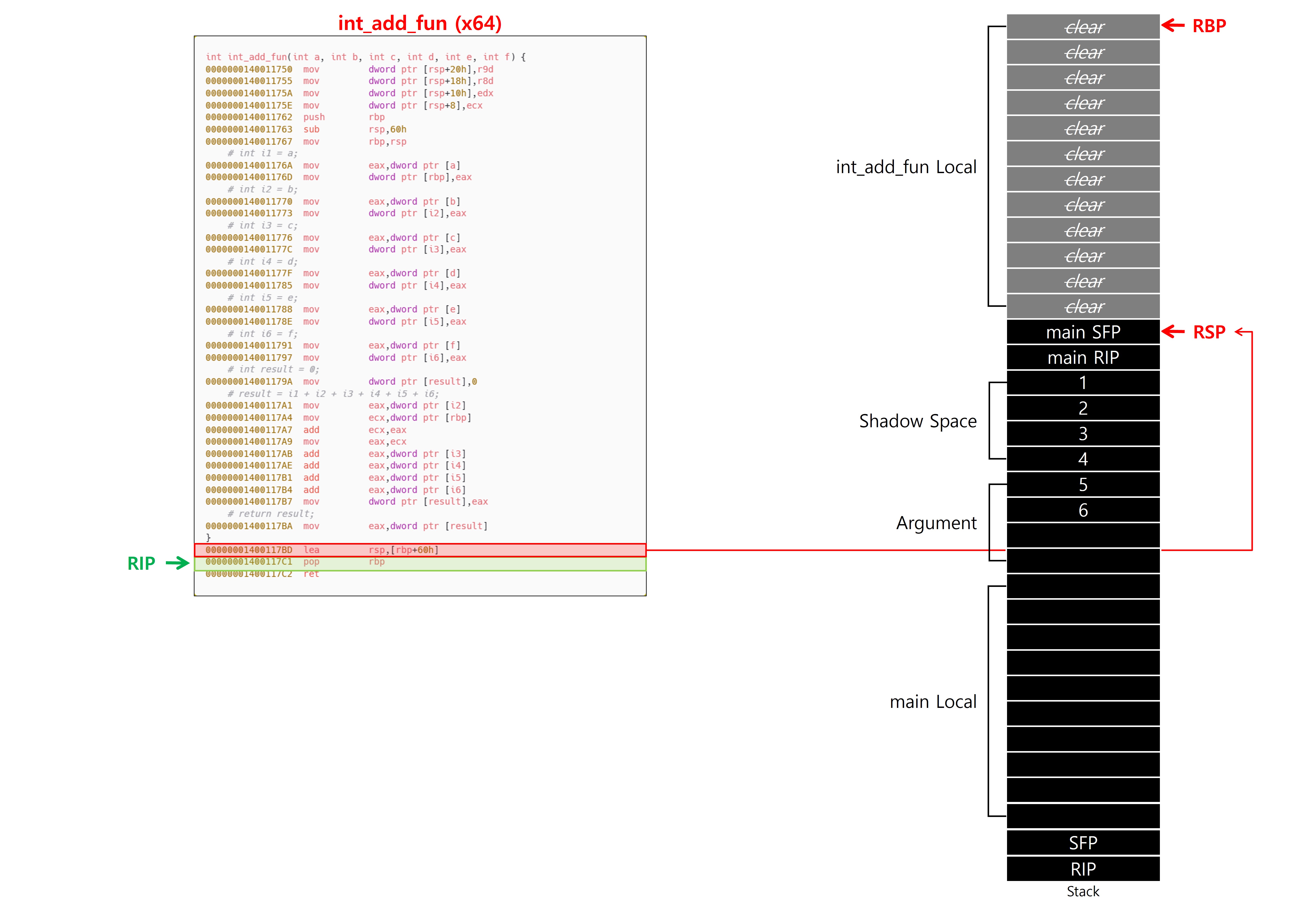 int_add_fun의 에필로그에 나타나는 lea rsp, [rbp+60h] 또는 add rsp, imm 명령을 실행한 결과, 이는 int_add_fun 함수 내부에서 확보했던 Local 영역만 정리하고 호출자가 전달한 인자 영역은 그대로 남아 있다는 점을 통해, 해당 명령이 정리하는 범위가 피호출자 내부의 스택 프레임에 국한된다는 사실을 확인할 수 있다.