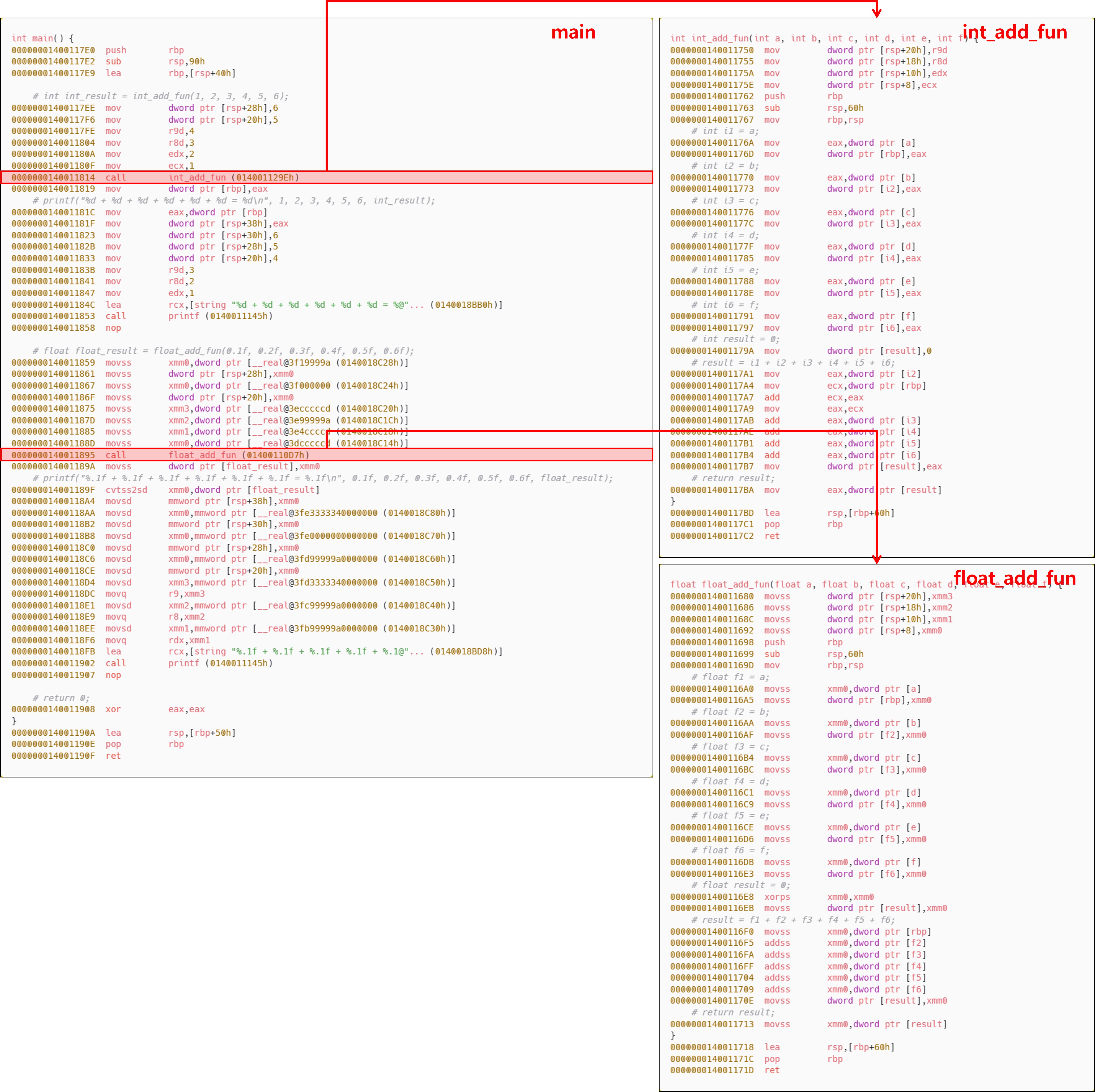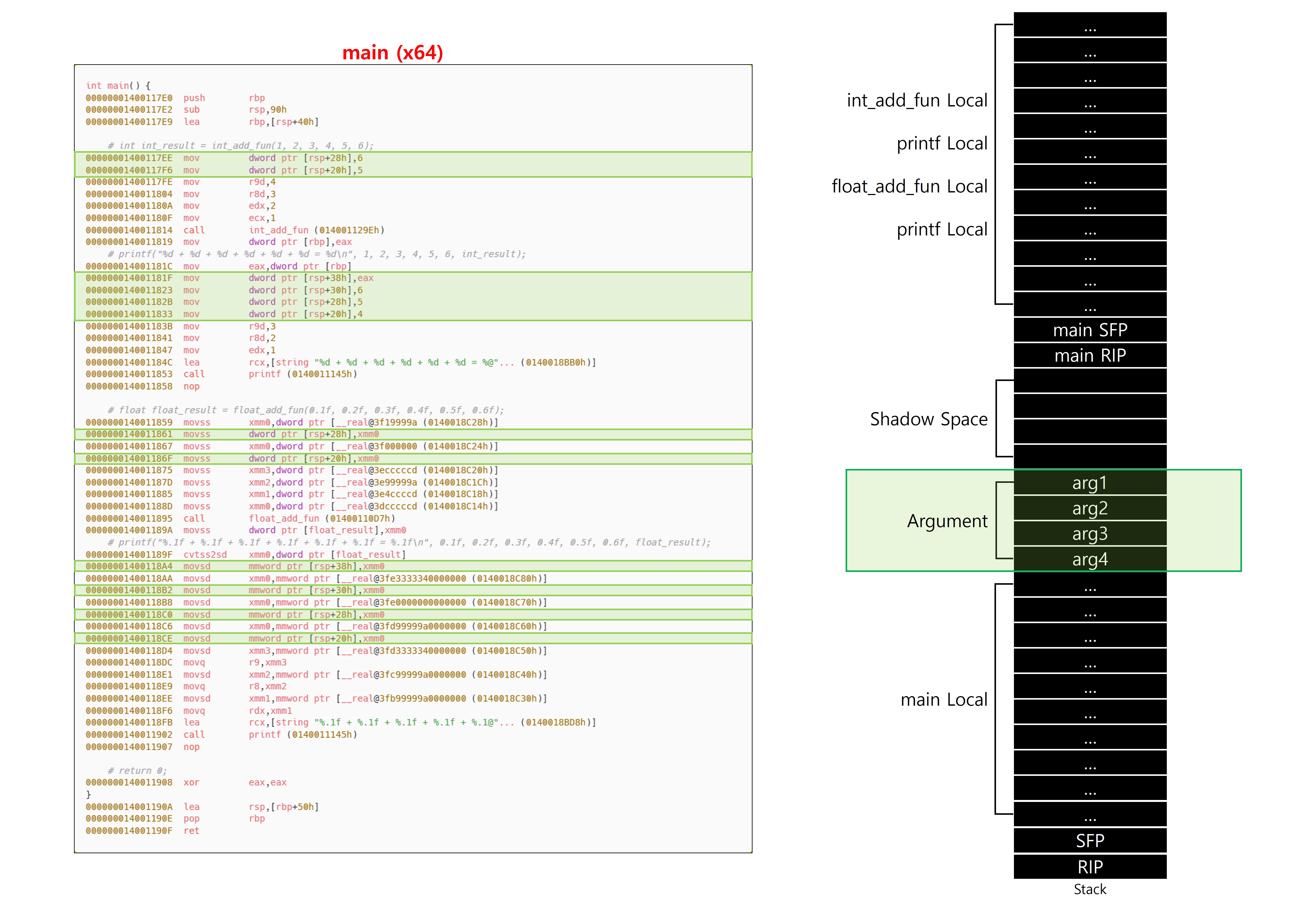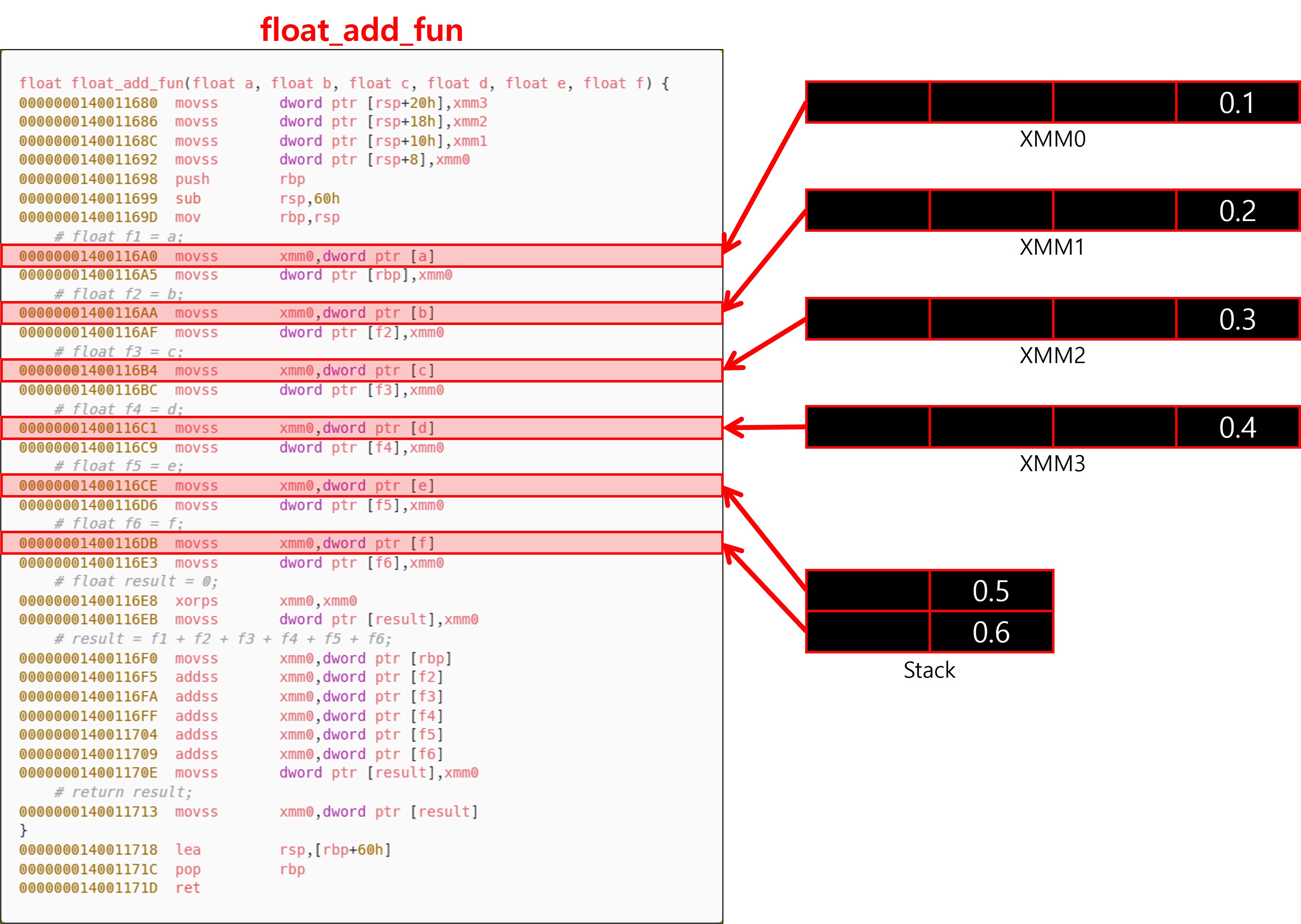부동소수점 및 SIMD 인수는 XMM0, XMM1, XMM2, XMM3까지 최대 4개 레지스터를 사용하며, 이 네 개를 초과하는 인수는 스택을 통해 전달된다.