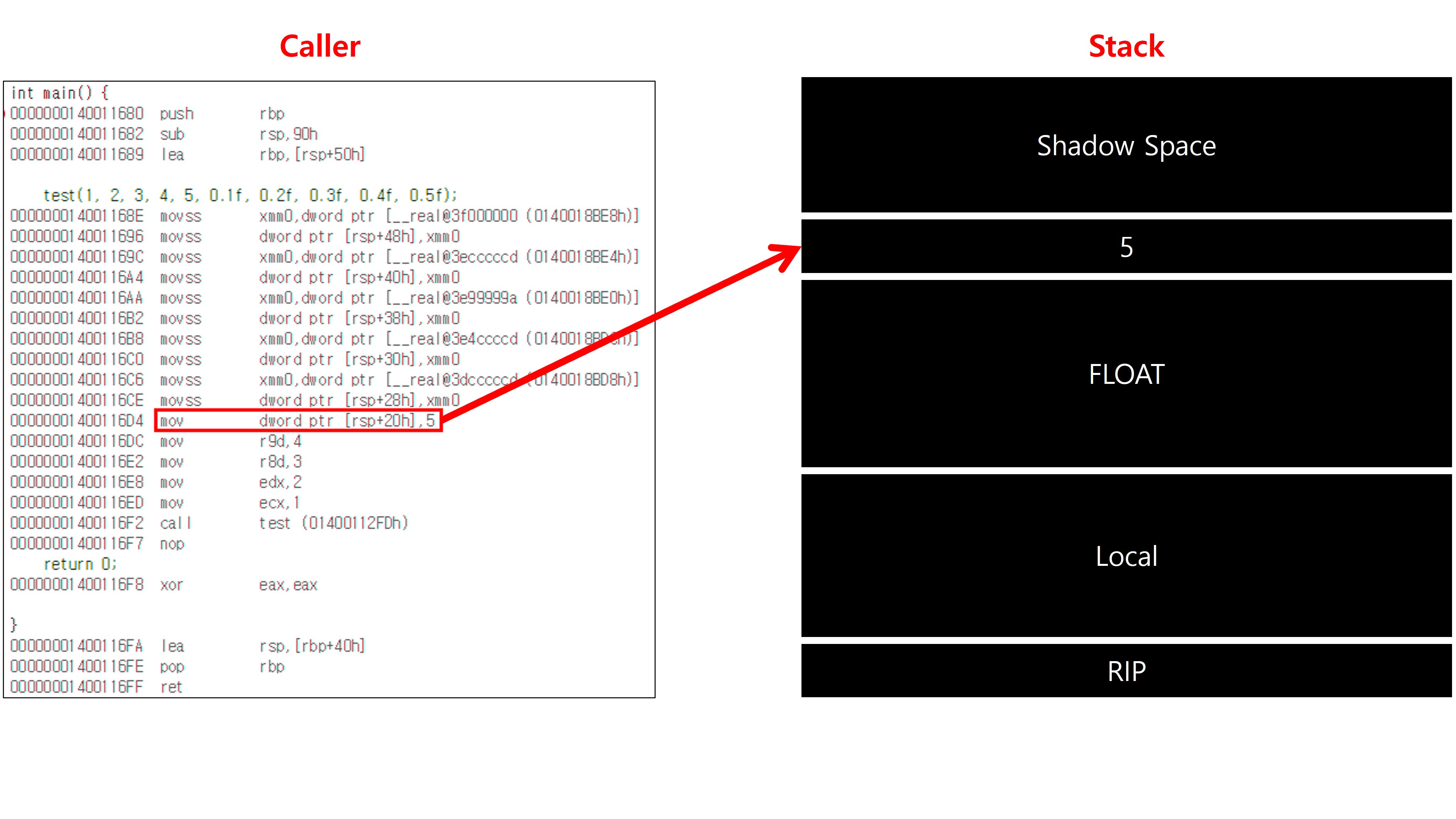 첫 4개의 정수형 인자는 RCX, RDX, R8, R9에, 부동소수점 인자는 XMM0–3에 전달한다. | 5번째 이후의 인자는 스택에 저장된다. |